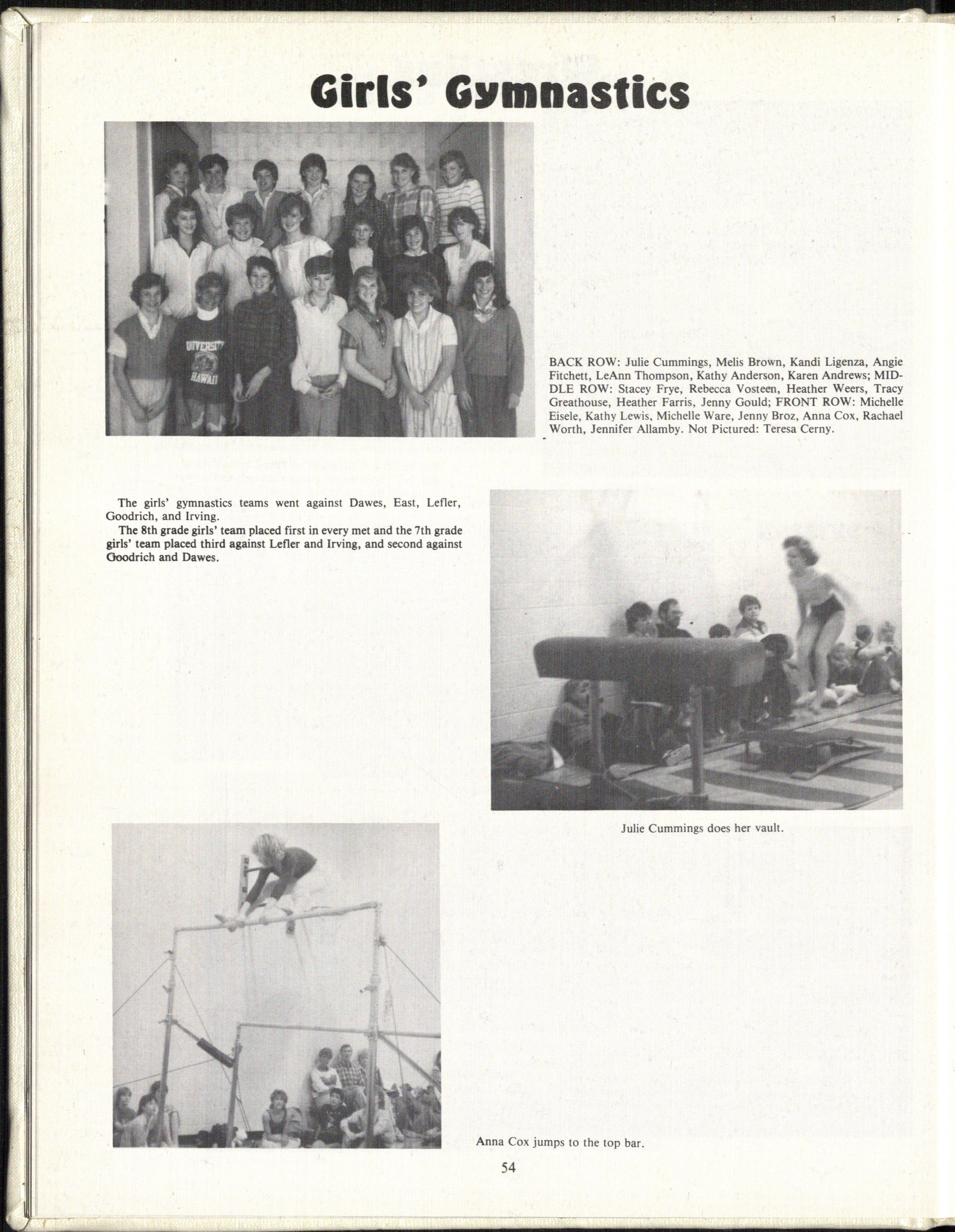 The girls' gymnastics teams went against Dawes, East, Lefler, Goodrich, and Irving.