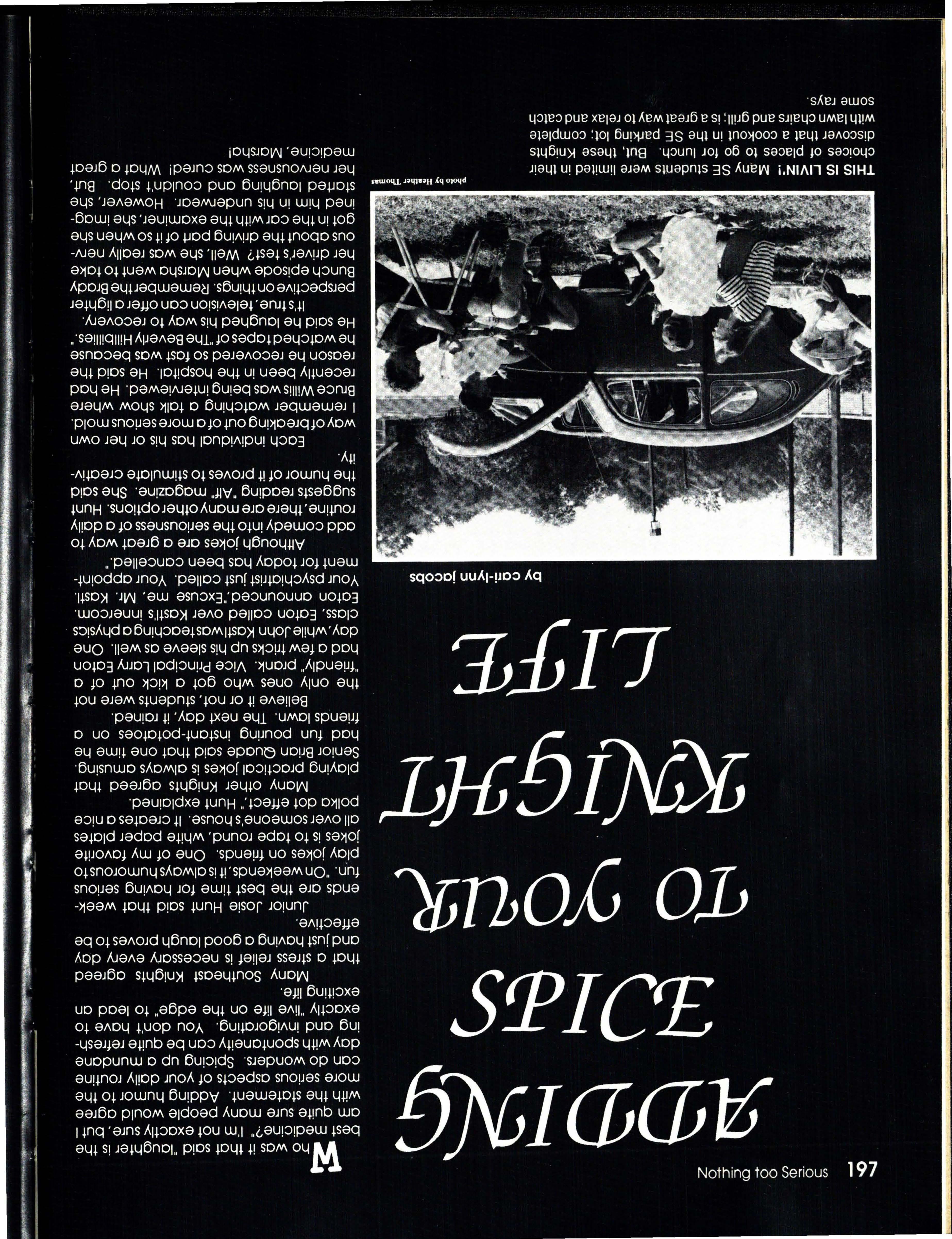 Undeniably, life didn't always run smoothly for students . The new Peer Helping group at Southeast helped many students who had trouble coping with things like school, parents, and friends. Through the good and bad times , the Knights experienced each day's surprises , pulling together to remain 'first of all.·