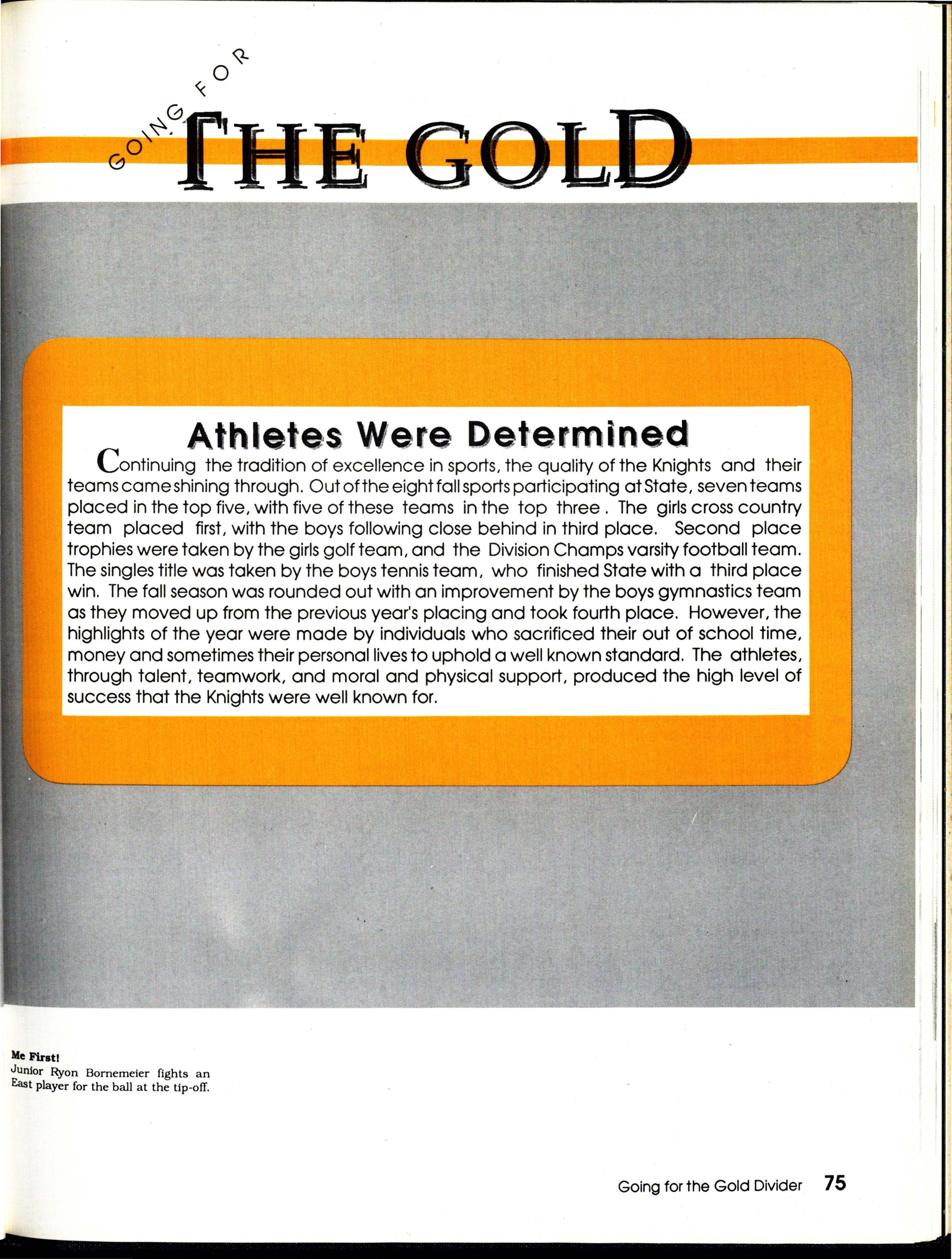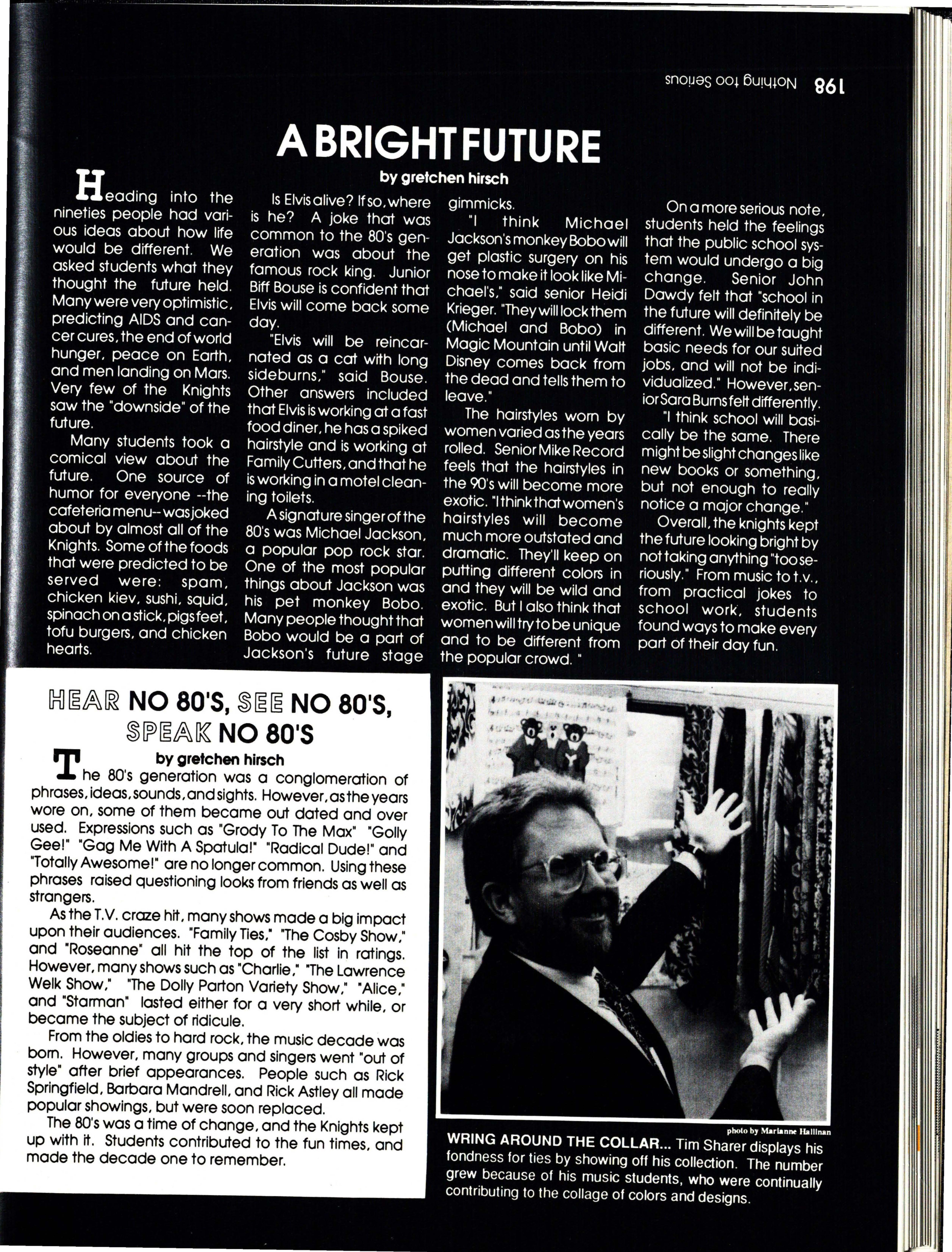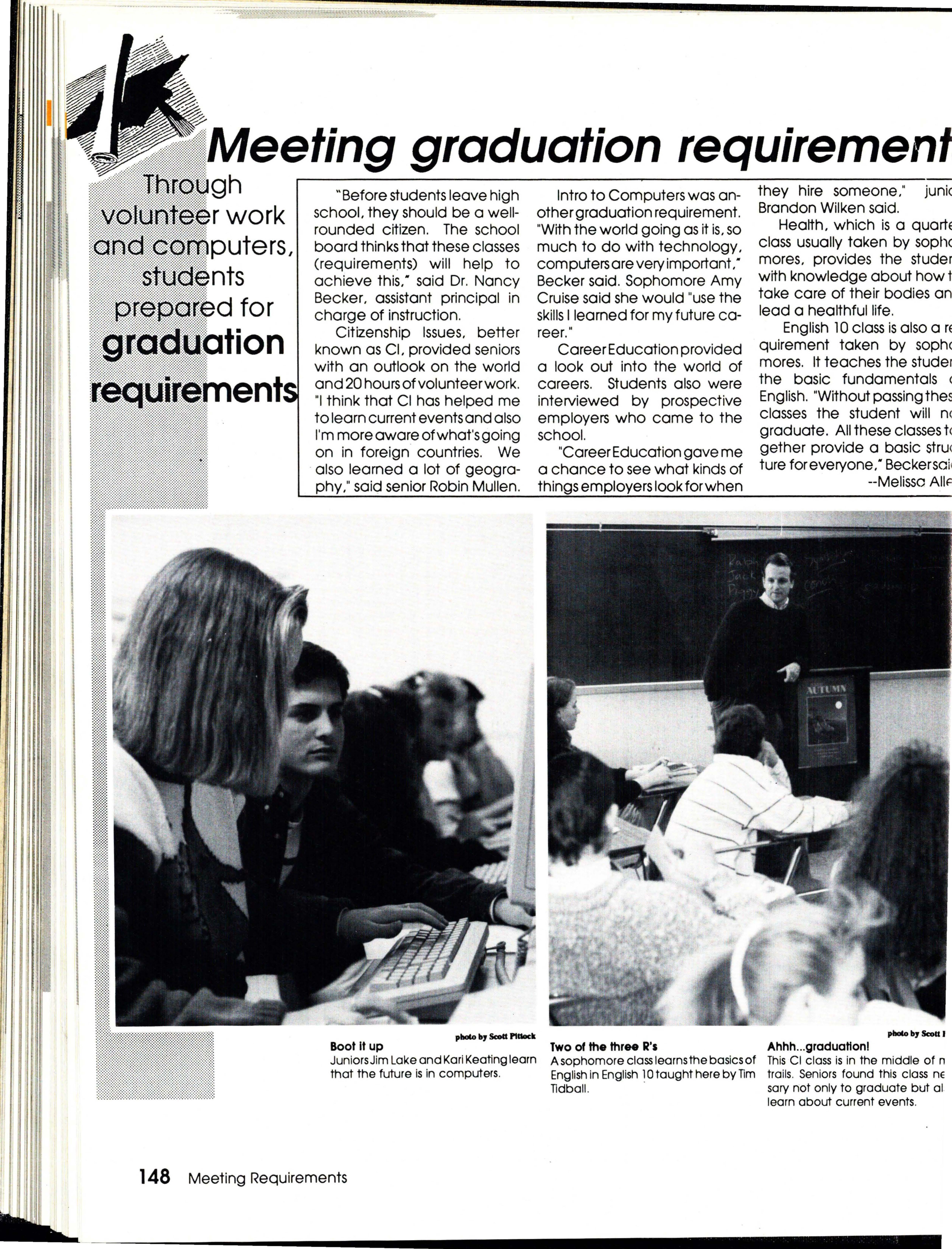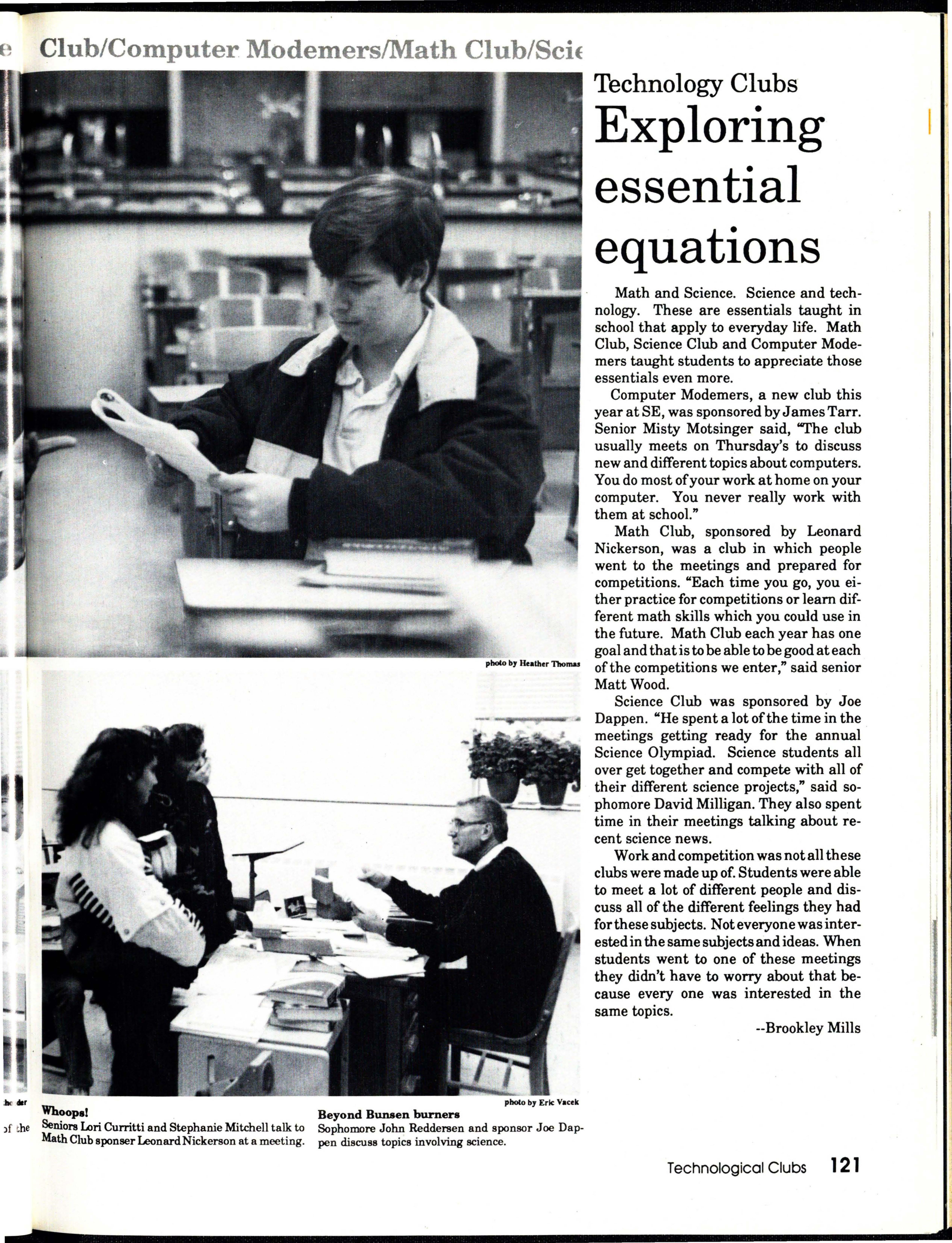 The copy was typeset by the yearbook staff using the Macintosh computers with the LaserWriter II NT printer. The computer programs used to put the book were Microsoft Word and PageMaker The following fonts were used: Theme - Advante Garde; Student Life - Palatine; Clubs- New Century Schoolbook; Sports- Bookman ;