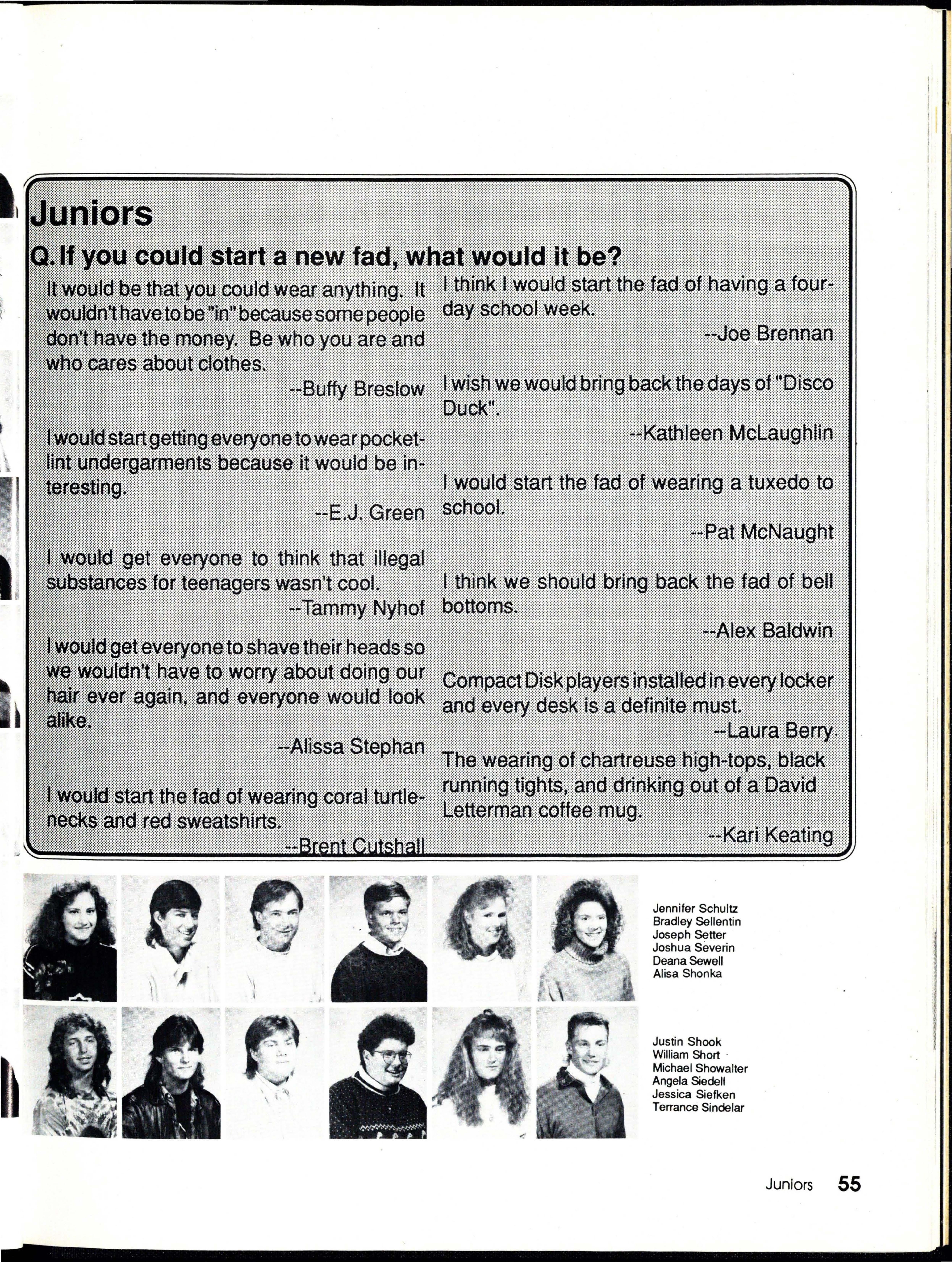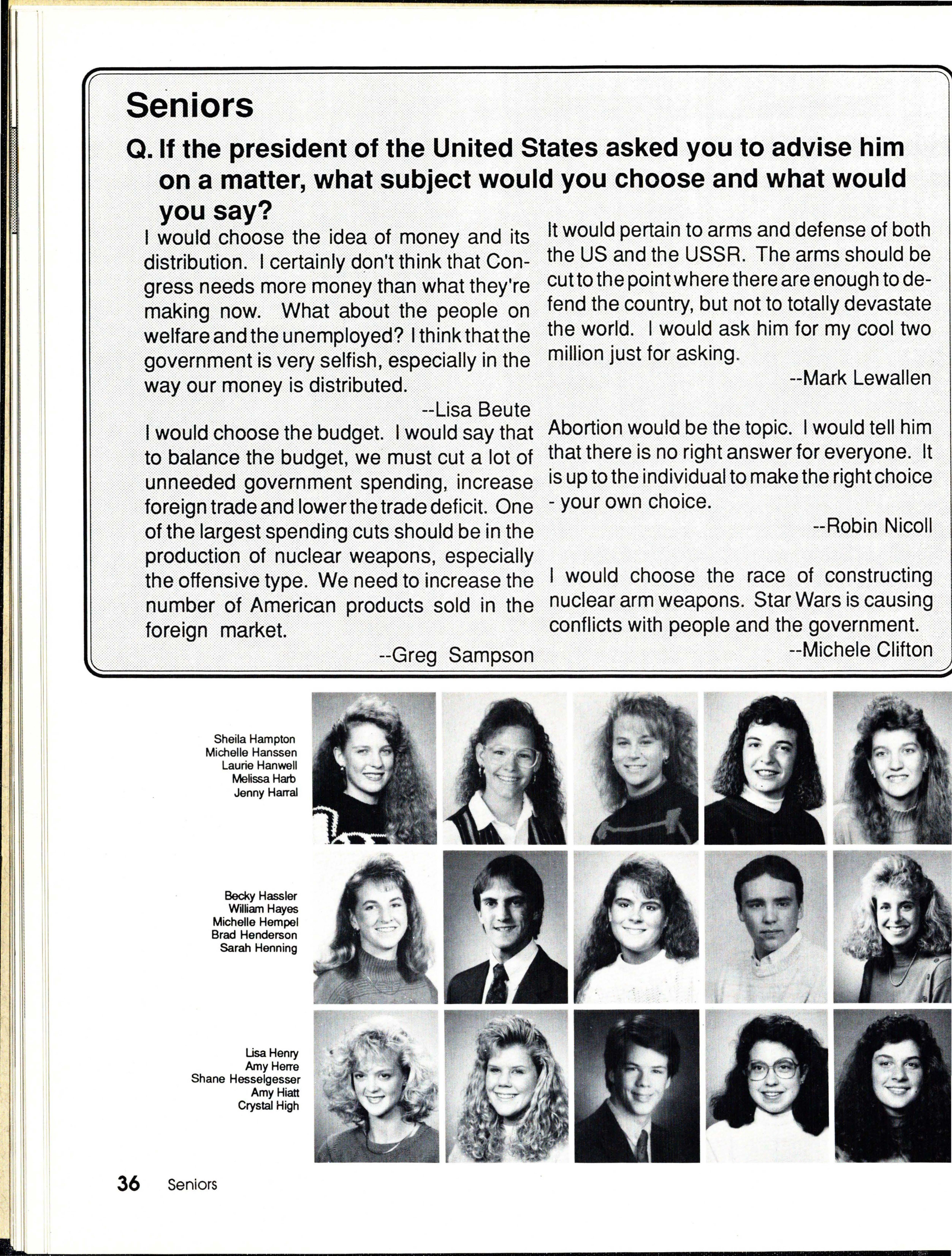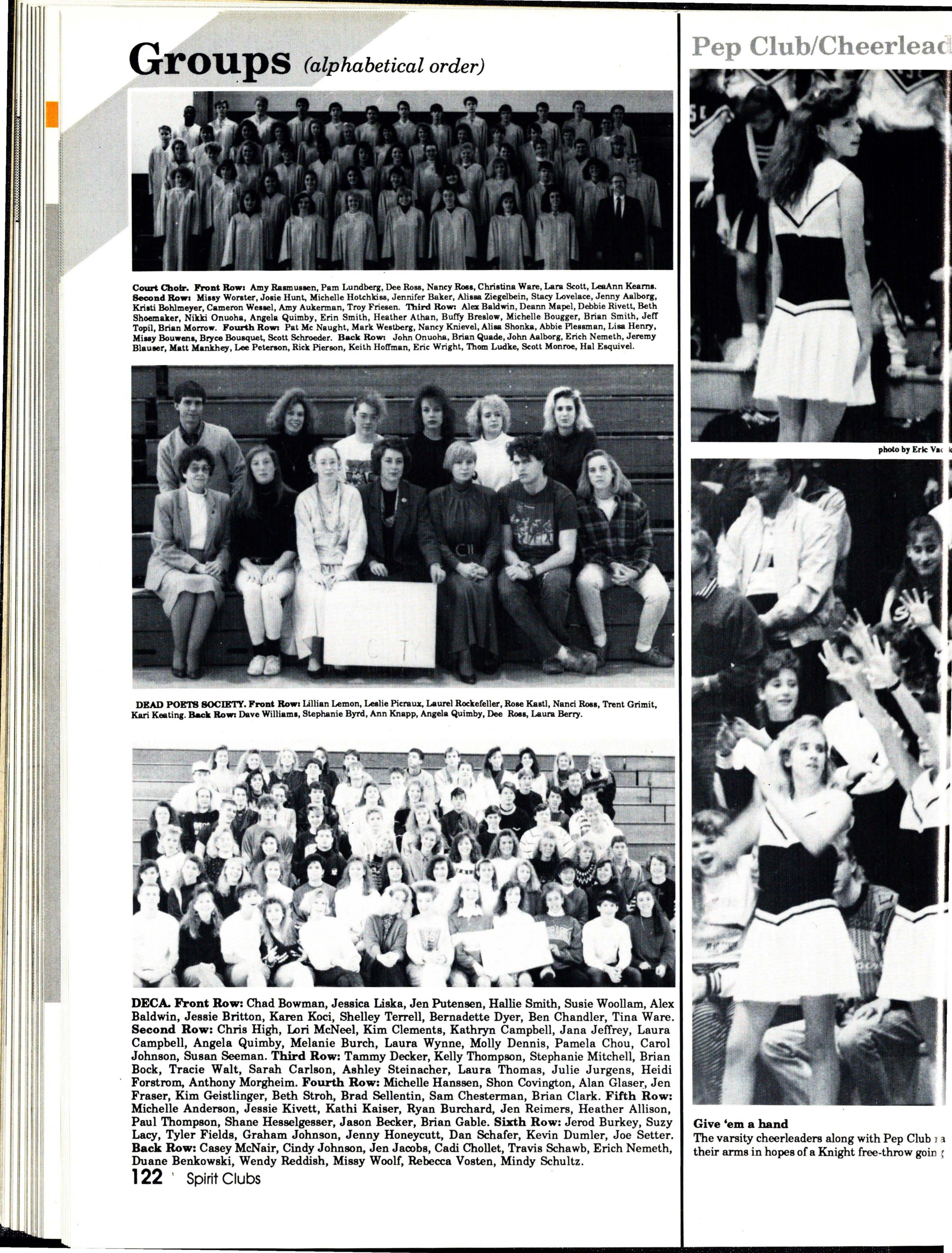 The copy was typeset by the yearbook staff using the Macintosh computers with the LaserWriter II NT printer. The computer programs used to put the book were Microsoft Word and PageMaker The following fonts were used: Theme - Advante Garde; Student Life - Palatine; Clubs- New Century Schoolbook; Sports- Bookman ;