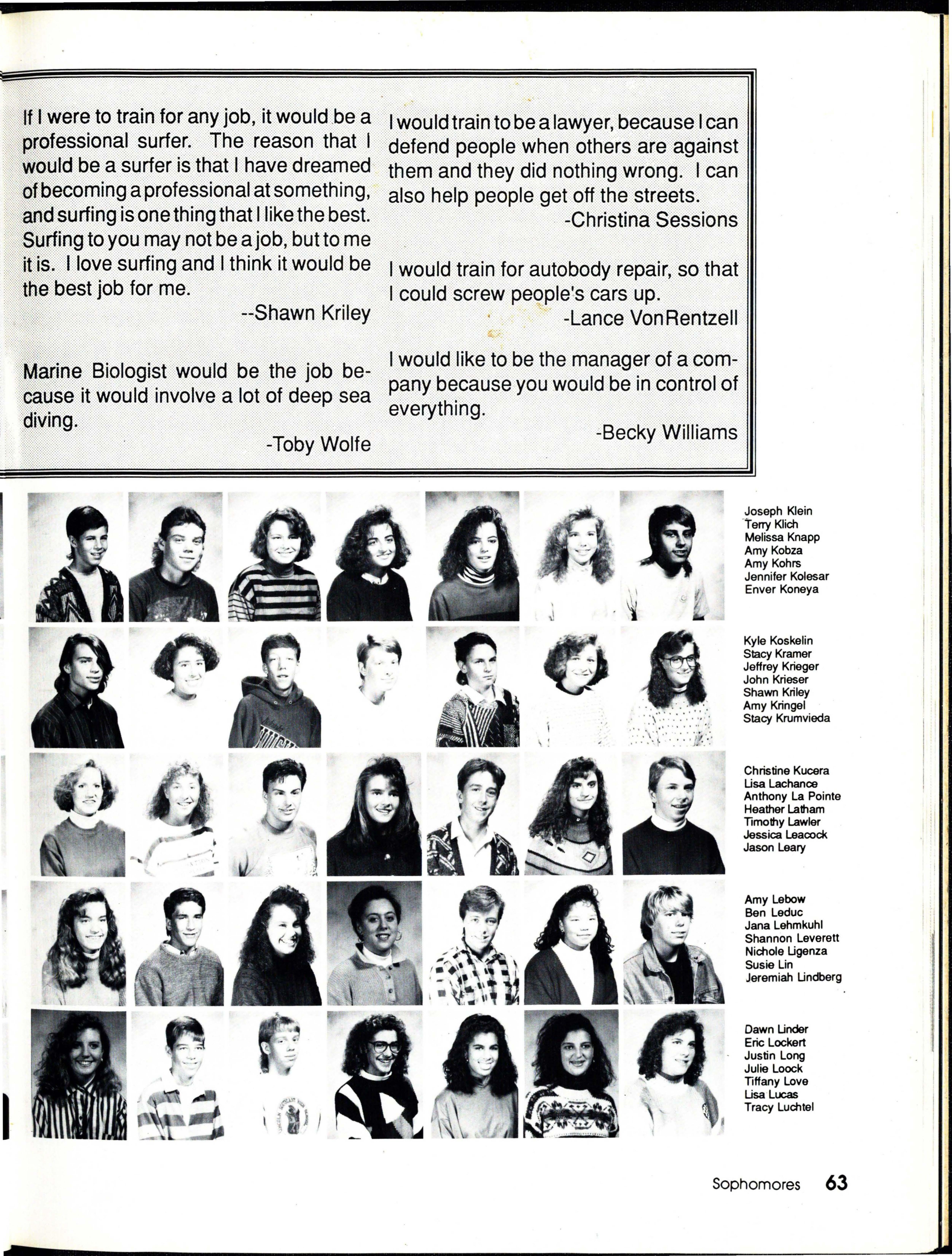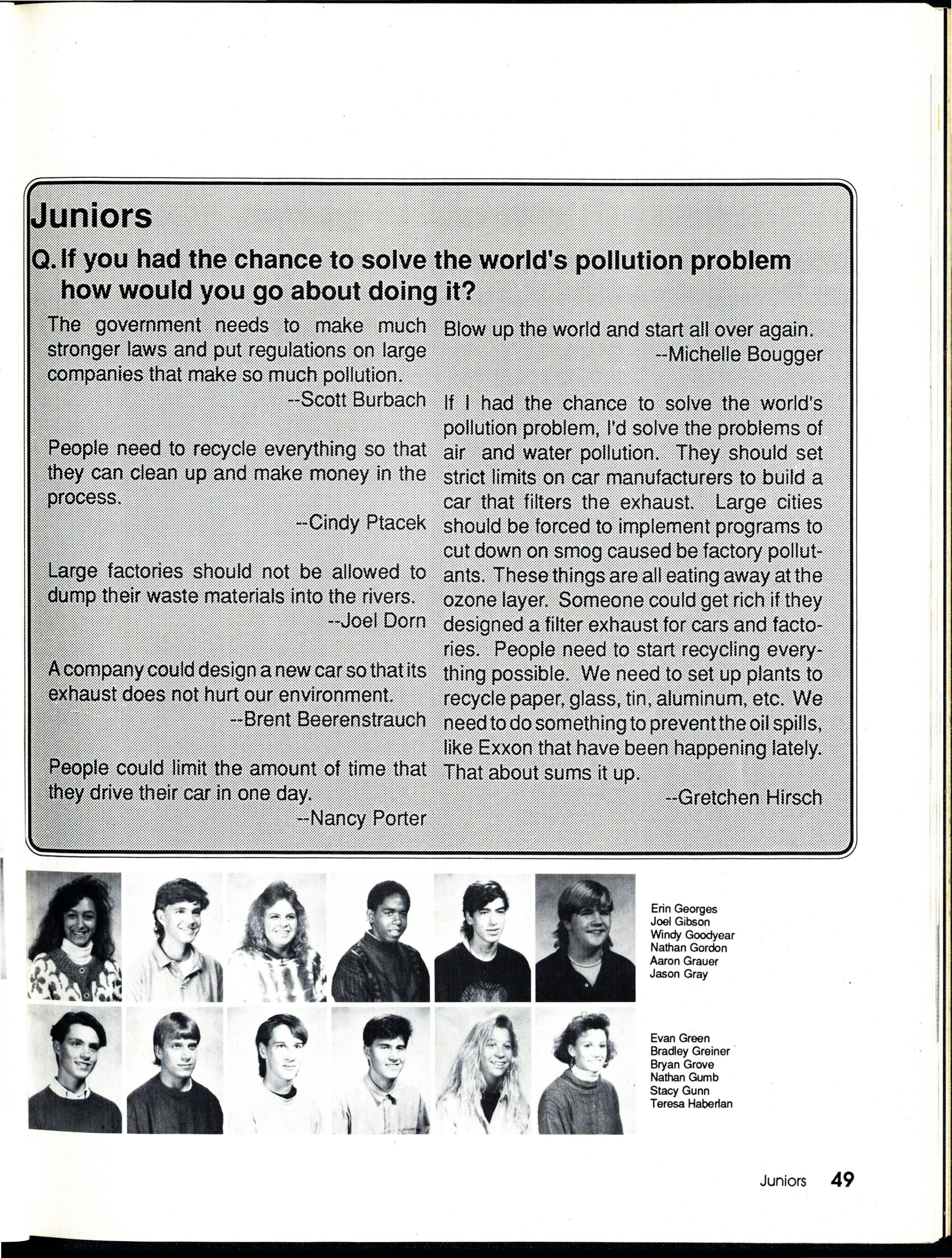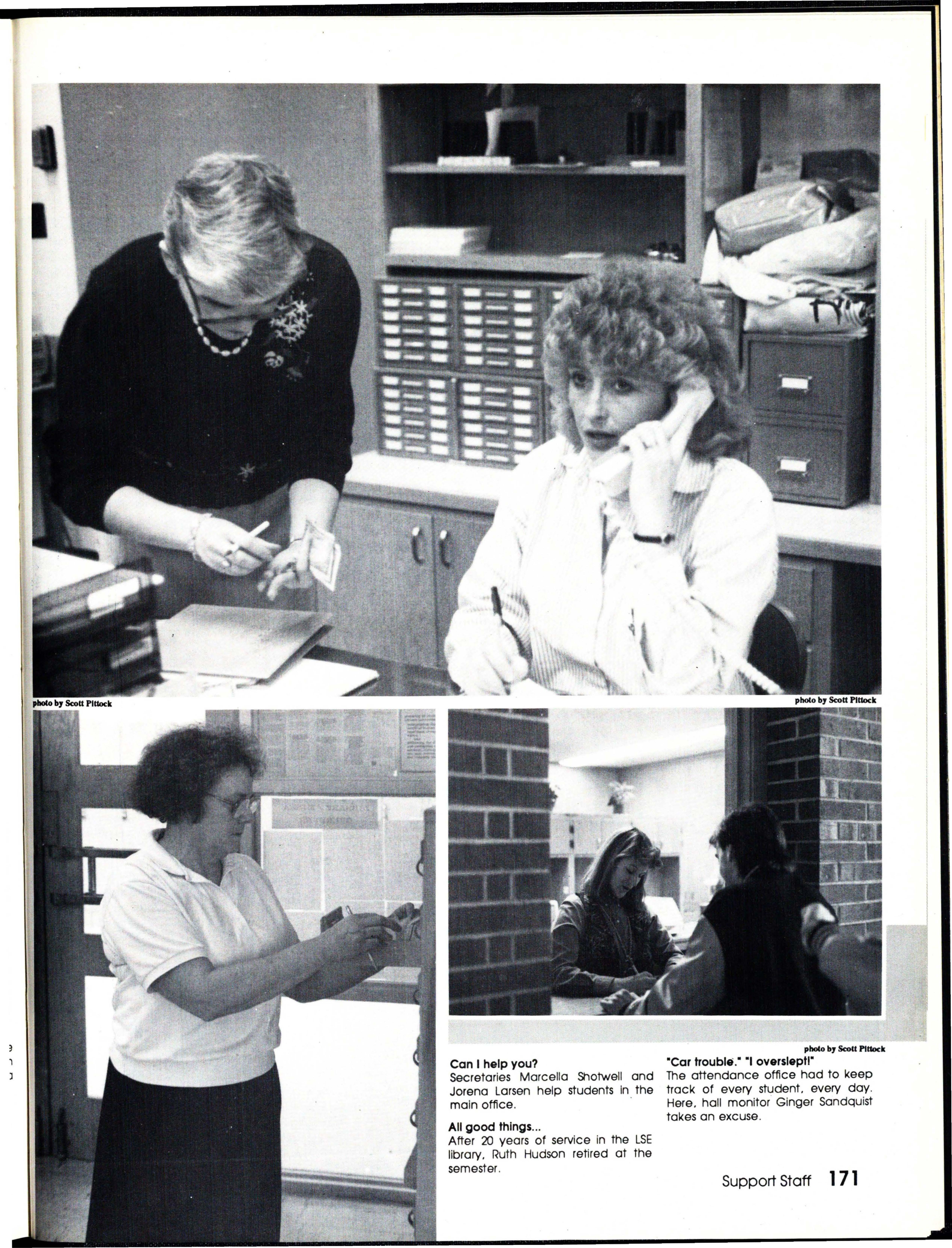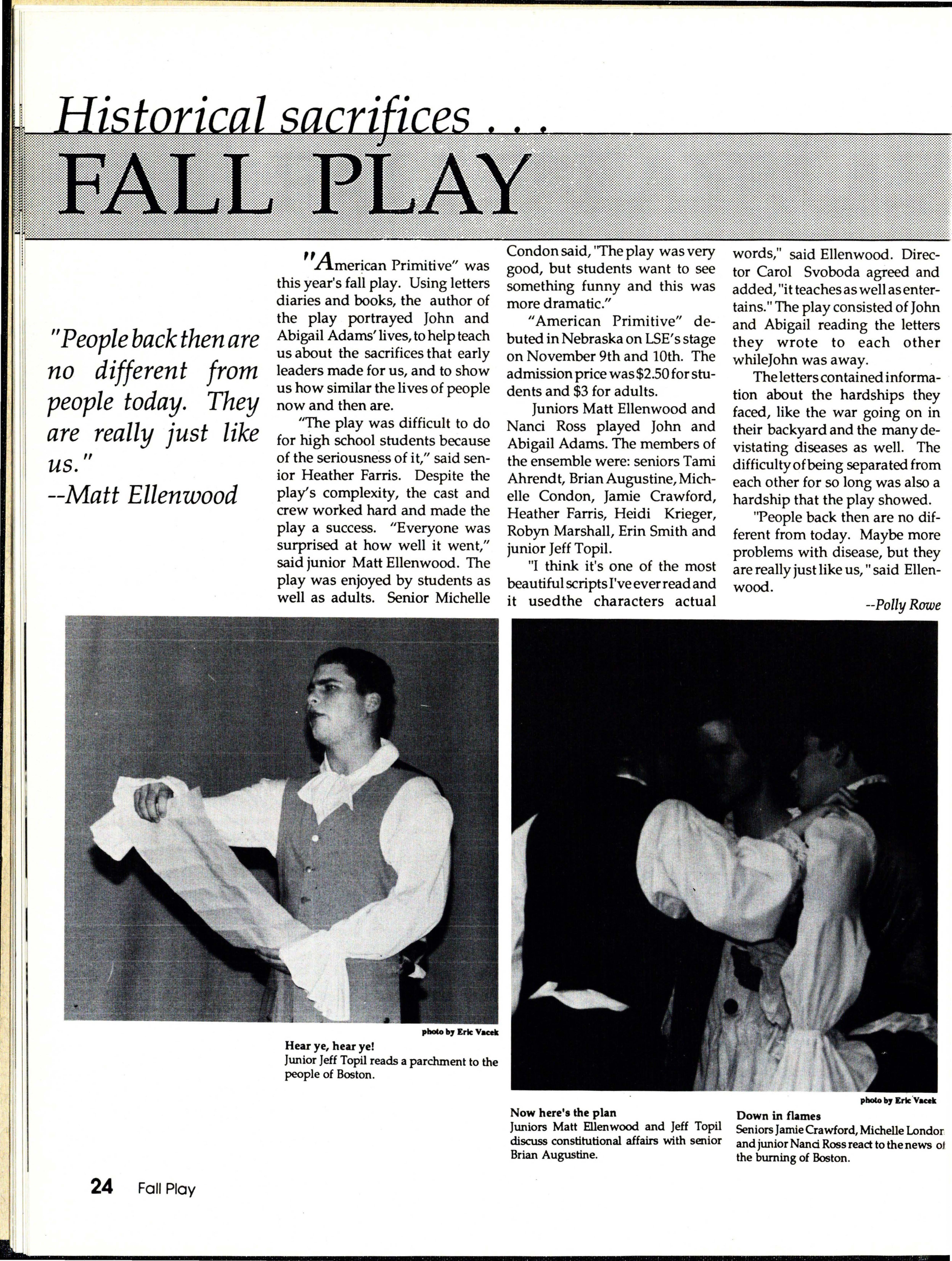 The copy was typeset by the yearbook staff using the Macintosh computers with the LaserWriter II NT printer. The computer programs used to put the book were Microsoft Word and PageMaker The following fonts were used: Theme - Advante Garde; Student Life - Palatine; Clubs- New Century Schoolbook; Sports- Bookman ;