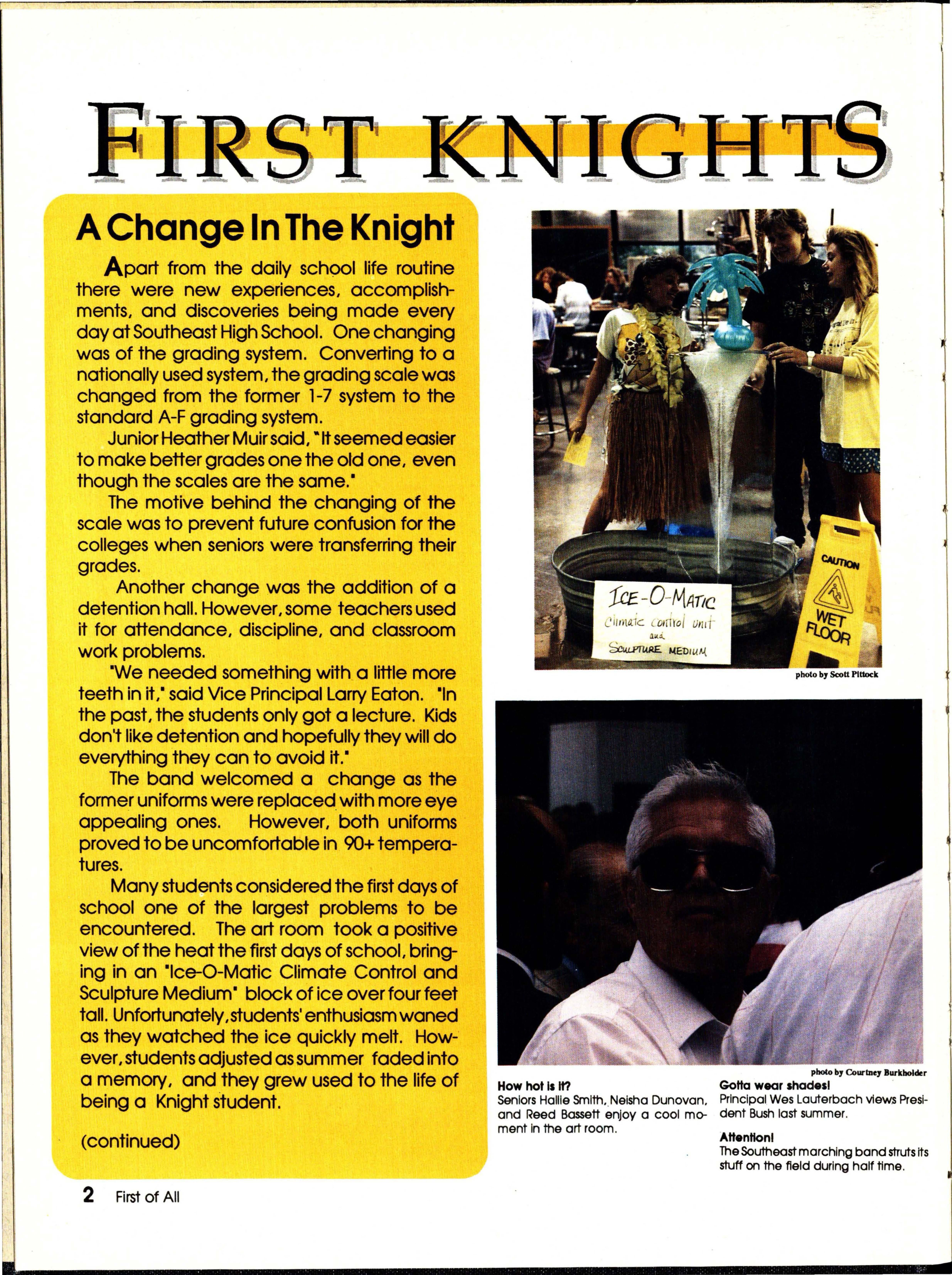 Many students considered the first days of school one of the largest problems to be encountered The art room took a positive view of the heat the first days of school, bringing in an "lce-0-Matic Climate Control and Sculpture Medium· block of ice over four feet tall . Unfortunately ,students' enthusiasm waned as they watched the ice quickly melt However, students adjusted as summer faded into a memory , and they grew used to the life of being a Knight student .