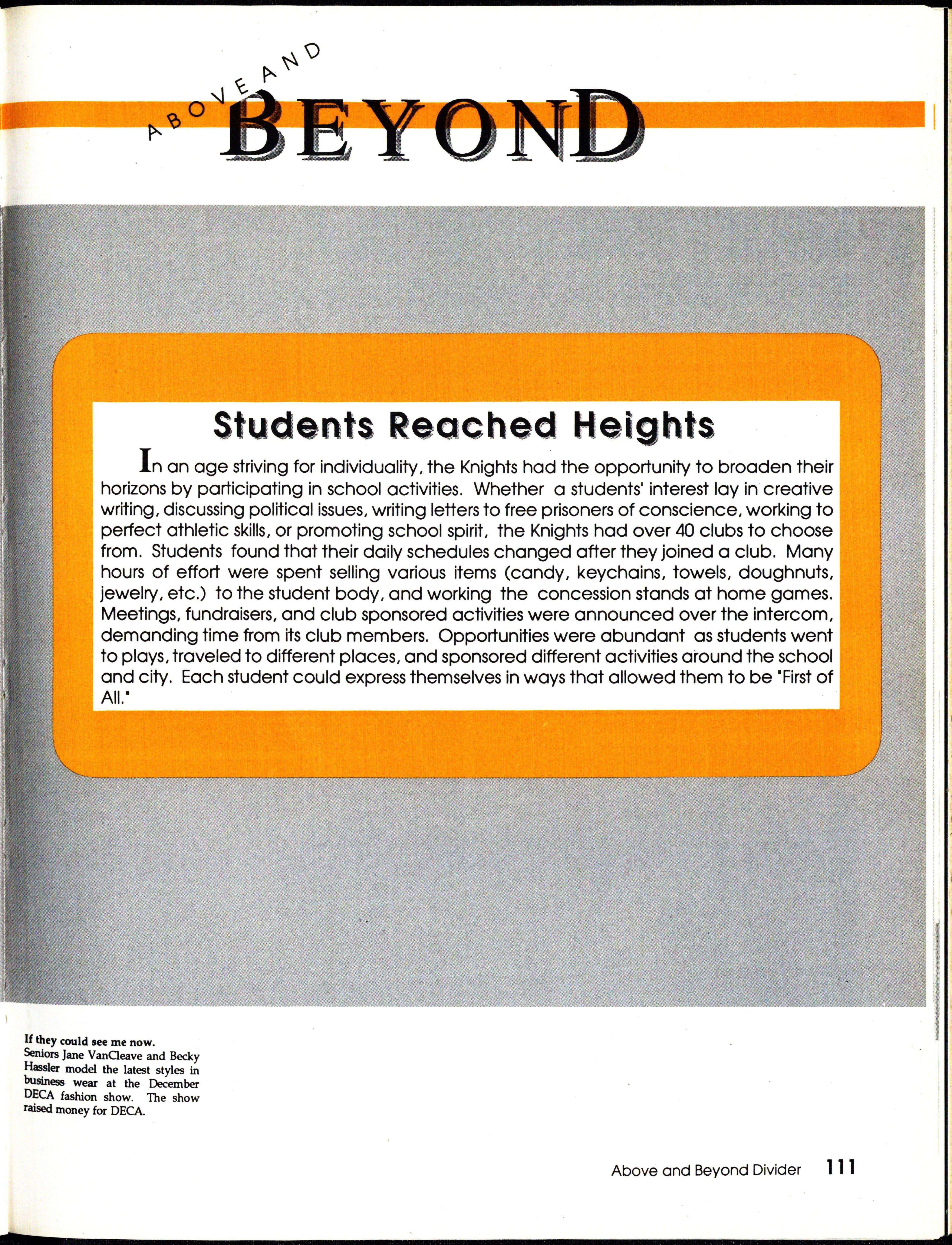110 ABOVE AND BEYOND the e~pected, students · reached for new heights and broadened their horizons by being involved in school activities.