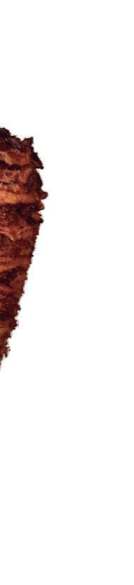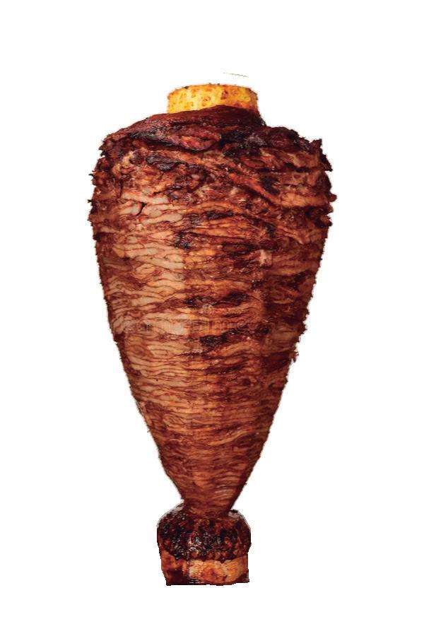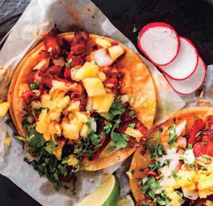 El secreto del taco al pastor está en su preparación. La carne marinada se coloca cuidadosamente en el trompo, una torre giratoria frente al fuego que permi te una cocción pareja y jugosa. Al cortarse, las finas lámi nas caen sobre la plancha y se mezclan con el jugo que desprende la piña asada, lo grando una combinación de sabores entre el picante, lo dulce y lo ácido. El resul tado: un taco equilibrado, aromático y visualmente irresistible.