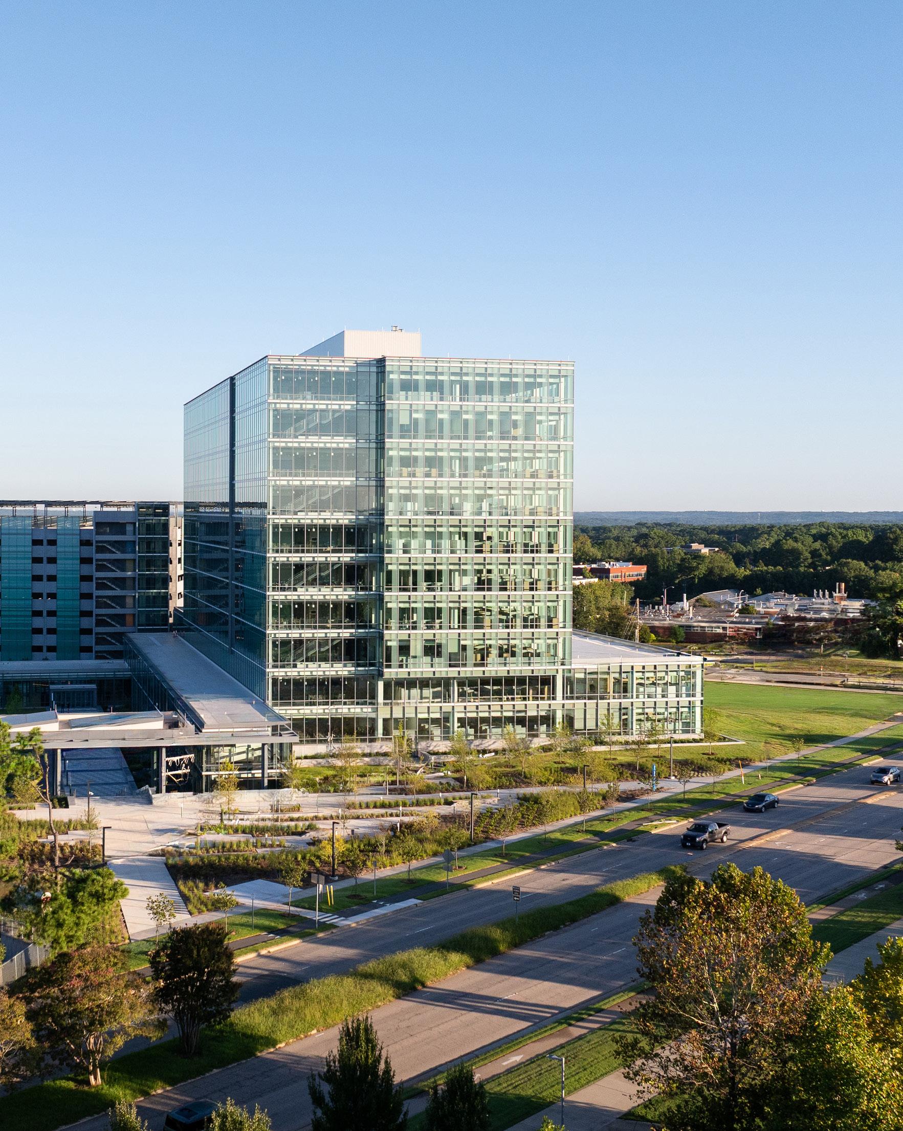 Anchored by an eleven-story, 460,000 SF office tower and nine-story parking deck, the first phase of the visionary NCDHHS campus is surrounded by walkable green spaces that spark new energy for Raleigh’s Blue Ridge Corridor. The design blends timeless architecture with community connectivity, prioritizing sustainability, accessibility, and human health. Promoting walking, biking, and transit, the campus fosters inclusivity, wellness, and public gathering while connecting seamlessly to the neighboring North Carolina Museum of Art.