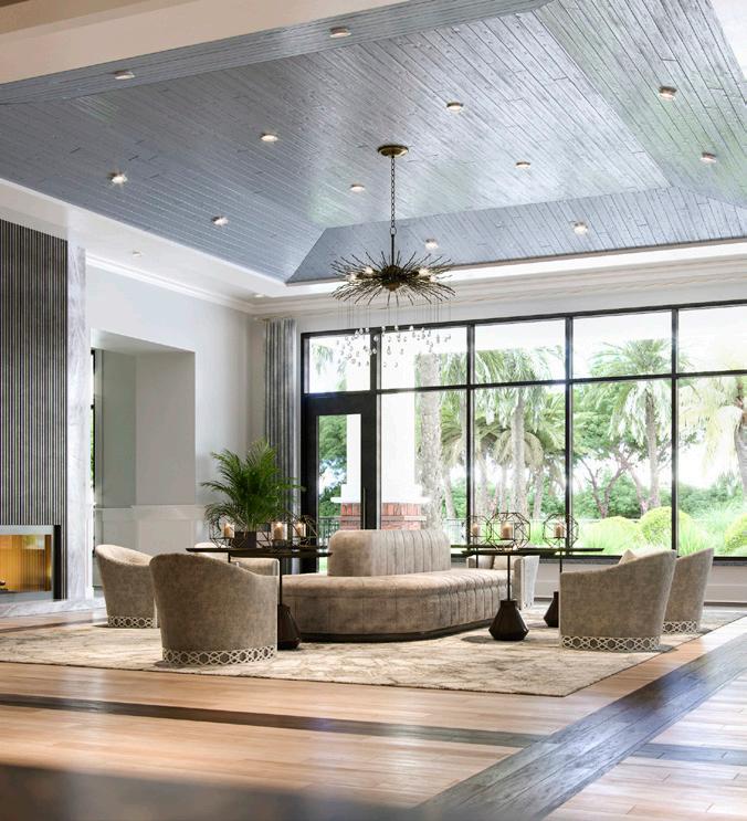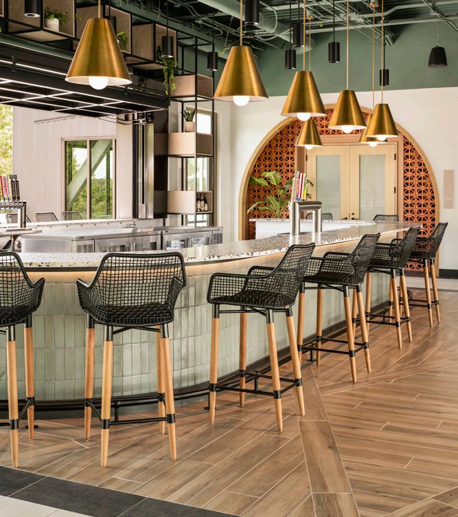 The two-story lobby showcases stunning feature walls drawing inspiration from the captivating mossdripped oak trees, which have long been an iconic symbol of the city’s charm and allure. At the far end of the lobby, nestled within the warm wood veneer, the bar creates a pocket – much like a dense maritime forest at dusk.