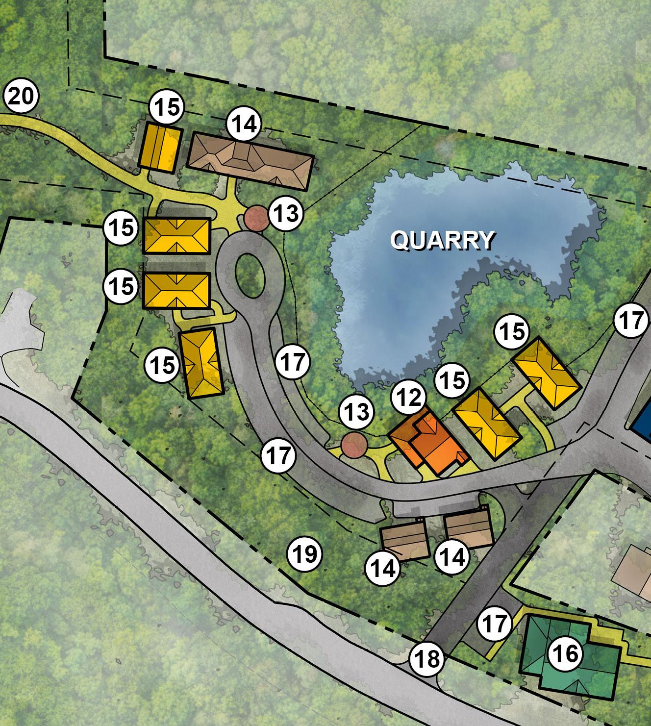 The Master Plan proposes creating an Artist Village, clustering housing around the existing inactive quarry where most of the current housing inventory is located.