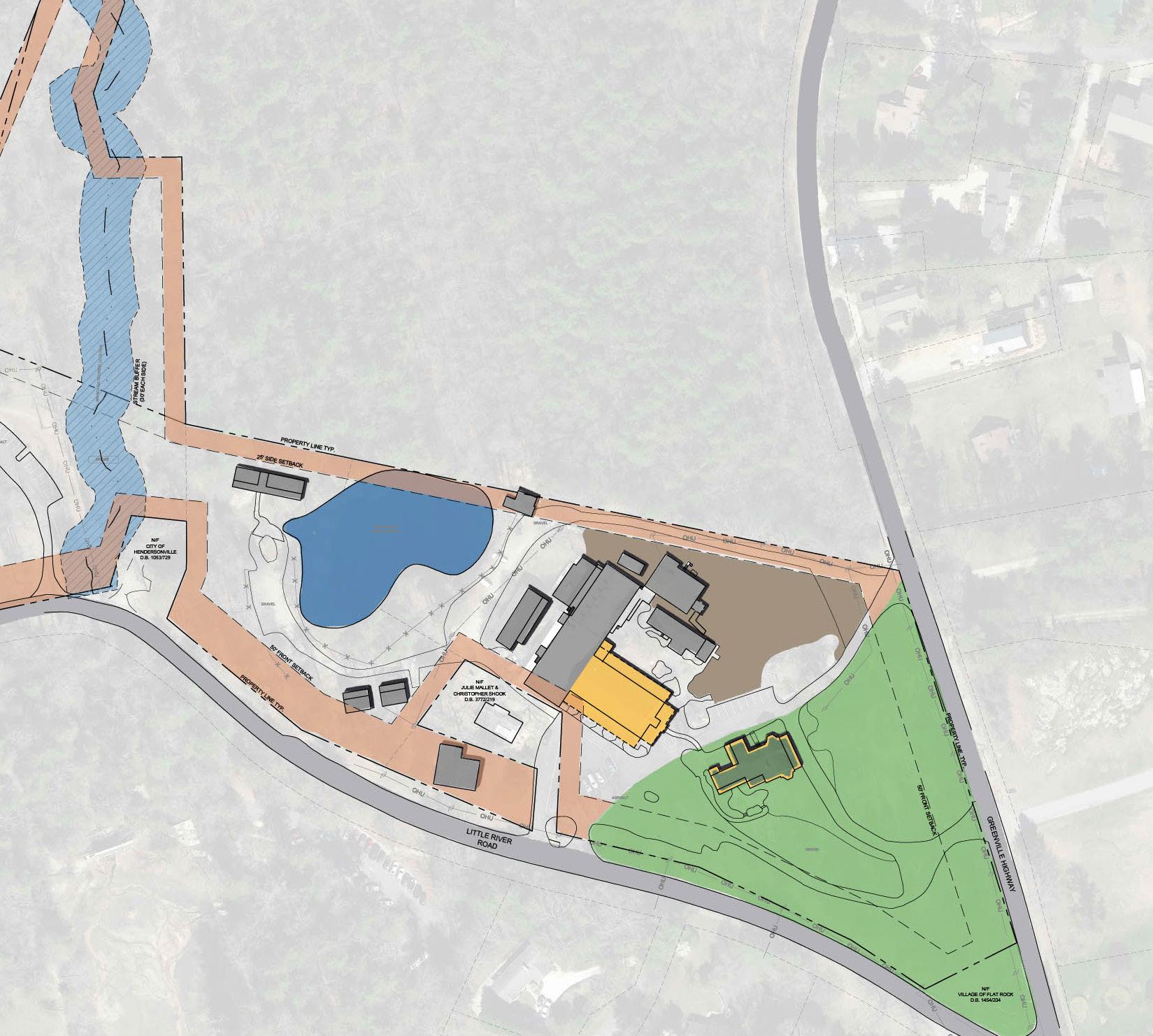 This study serves as a critical foundation for understanding the existing conditions of the Flat Rock Playhouse property. Developed in conjunction with the Constraints and Opportunities Plan, this analysis identifies key physical and regulatory elements that influence the site’s potential for development. By documenting these factors, the Existing Conditions Plan provides essential information to guide thoughtful and informed decision-making throughout the Master Planning process.