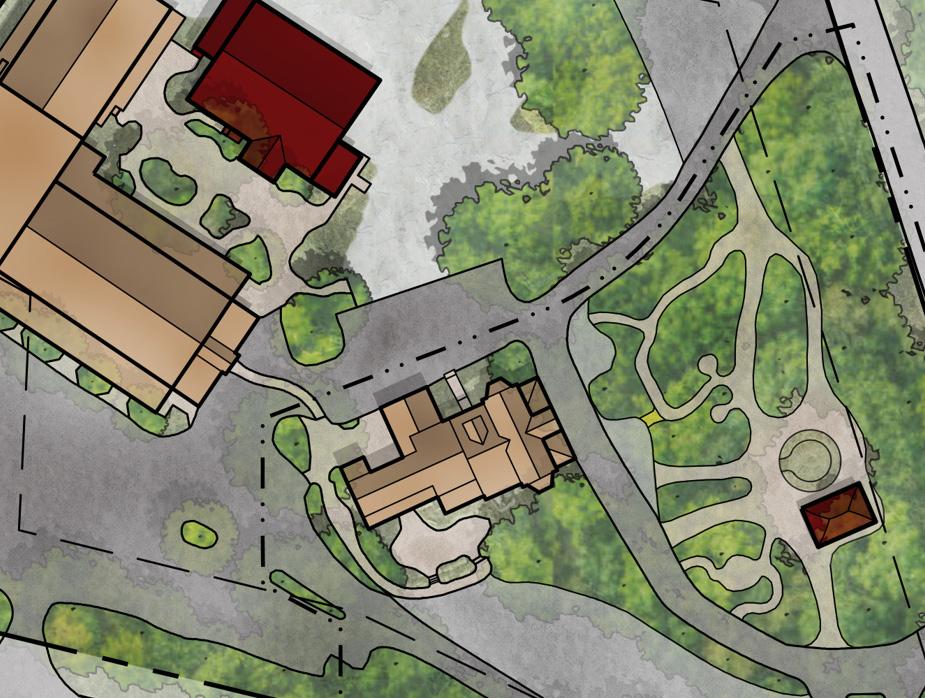 A key feature of the site is the natural topography, including a stream and deep ravine, which create a clear physical division across the property. This separation has a notable impact, especially on the current Education Building/Administration Offices, which are somewhat isolated from the central hub of campus activity. The distance and physical disconnect make administration and production staff communication and collaboration challenging.