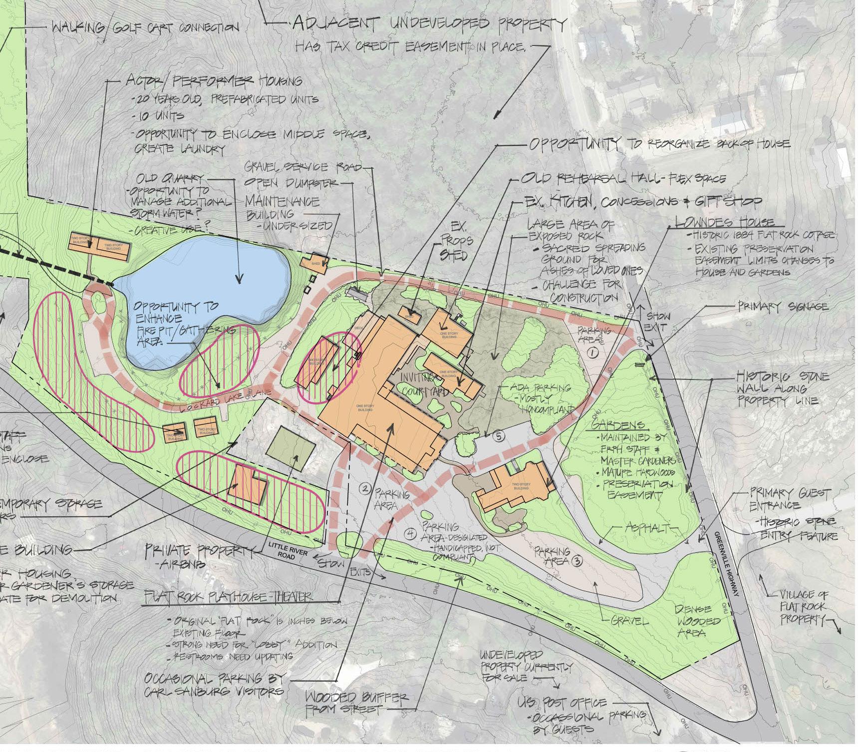 The Master Plan, a critical component of the Vagabond 360 Strategic Plan, analyzes existing conditions, facility needs, and anticipated program growth to enhance the Playhouse’s initiatives. It incorporates valuable feedback from various stakeholders, ensuring the plan respects the character of the Flat Rock Village historic area and maintains the distinctive aesthetic of the broader Flat Rock community.