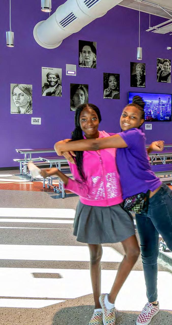 Contemporary elements such as asymmetrical window mullions, suspended ceiling “clouds,” and tall windows for maximum daylighting help to define and enliven the space. High-impact, low-cost branding elements such as strategic pops of color also reflect the girls’ energy.