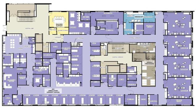 MOBs are often developed as a tenant in a typical ‘office building’ layout that has an elevator/stair core in the center of the building with a corridor system that serves office/clinic space on each side of the building. ASCs that are planned in this kind of layout tend to get ‘wrapped around’ the core and the flow and adjacencies become spread out and less efficient.