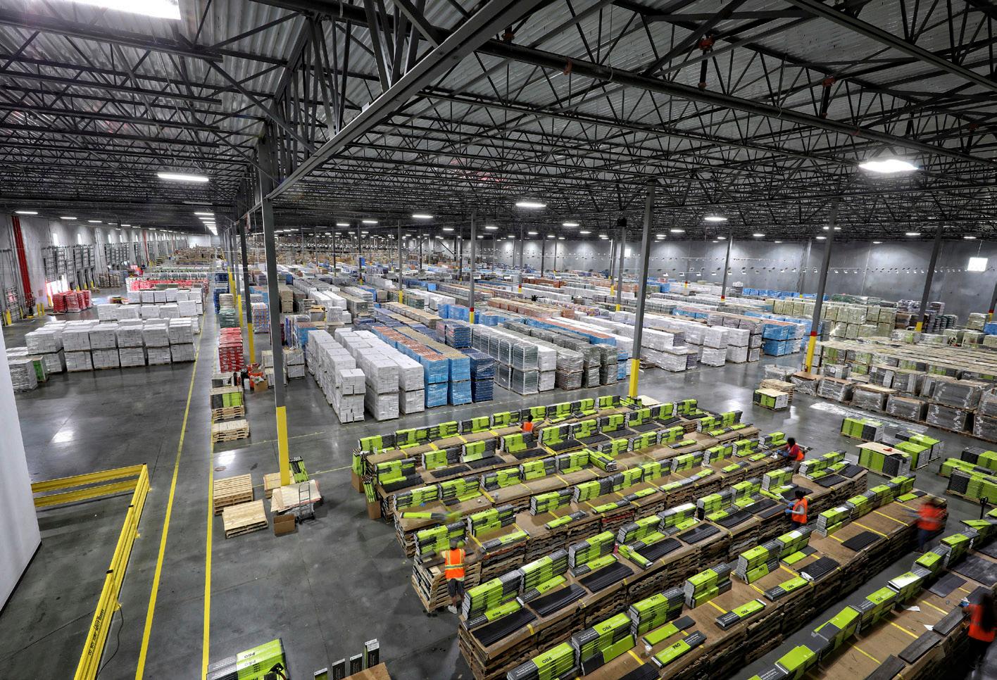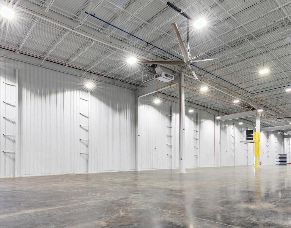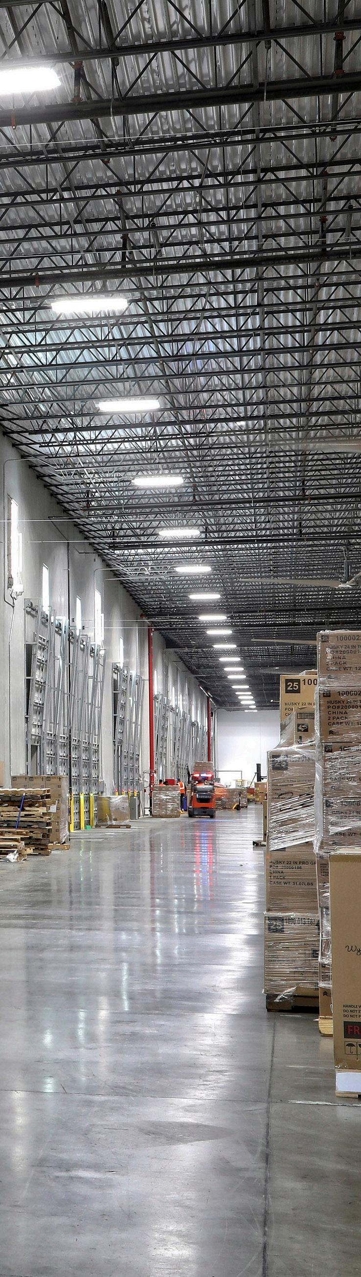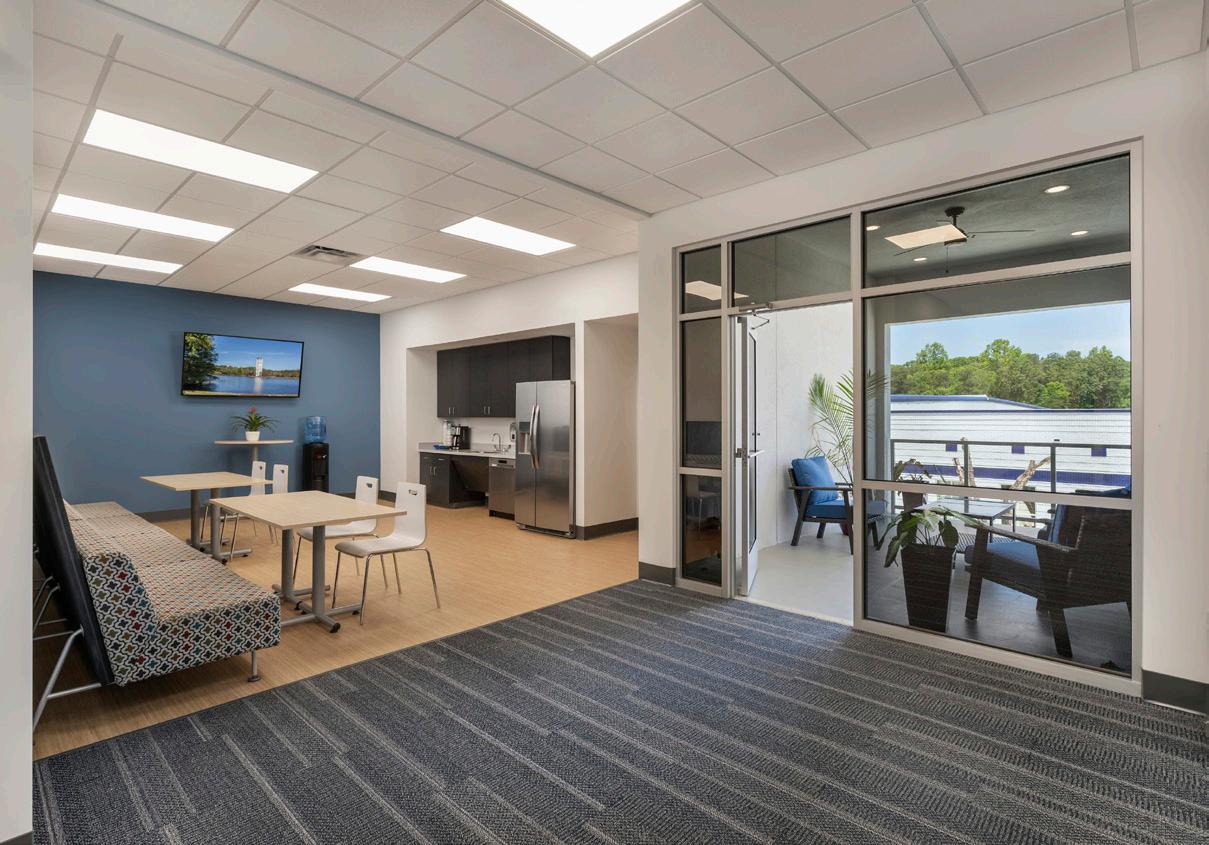 Skylights and curtainwall panels in the warehouse serve as excellent sources for natural daylight. The warehouse structure is precast concrete panel walls with steel frame and a jointless floor system; the office is steel construction with curtainwall and storefront glass, TPO roof, and metal panel exterior. In addition to designing the buildings, LS3P also facilitated the furniture selection and procurement.
