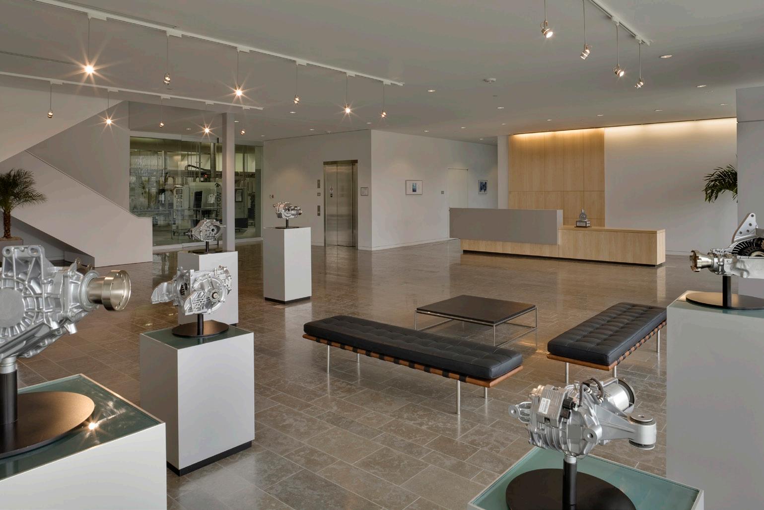 Design emphasis is on employee comfort: the ceilings are 11’-0” tall with all glass facades and all regularly occupied spaces are less than 30’-0” from exterior glass. The facades are designed with automated shade devices with solar-tracking capability. An 8’-0” wide covered, cantilevered balcony wraps the two glass facades providing shading and an additional employee amenity. First floor spaces adjacent to the plant have glass doors and windows to create a sense of unity between office and plant workers. Second floor conference rooms and all regularly occupied spaces on the plant side of the office building have clerestory glass for additional natural light. The significant use of daylight reduces the need for artificial lighting throughout the new office building. The project achieved LEED® Silver certification. The company was acquired by GKN Driveline in 2011.