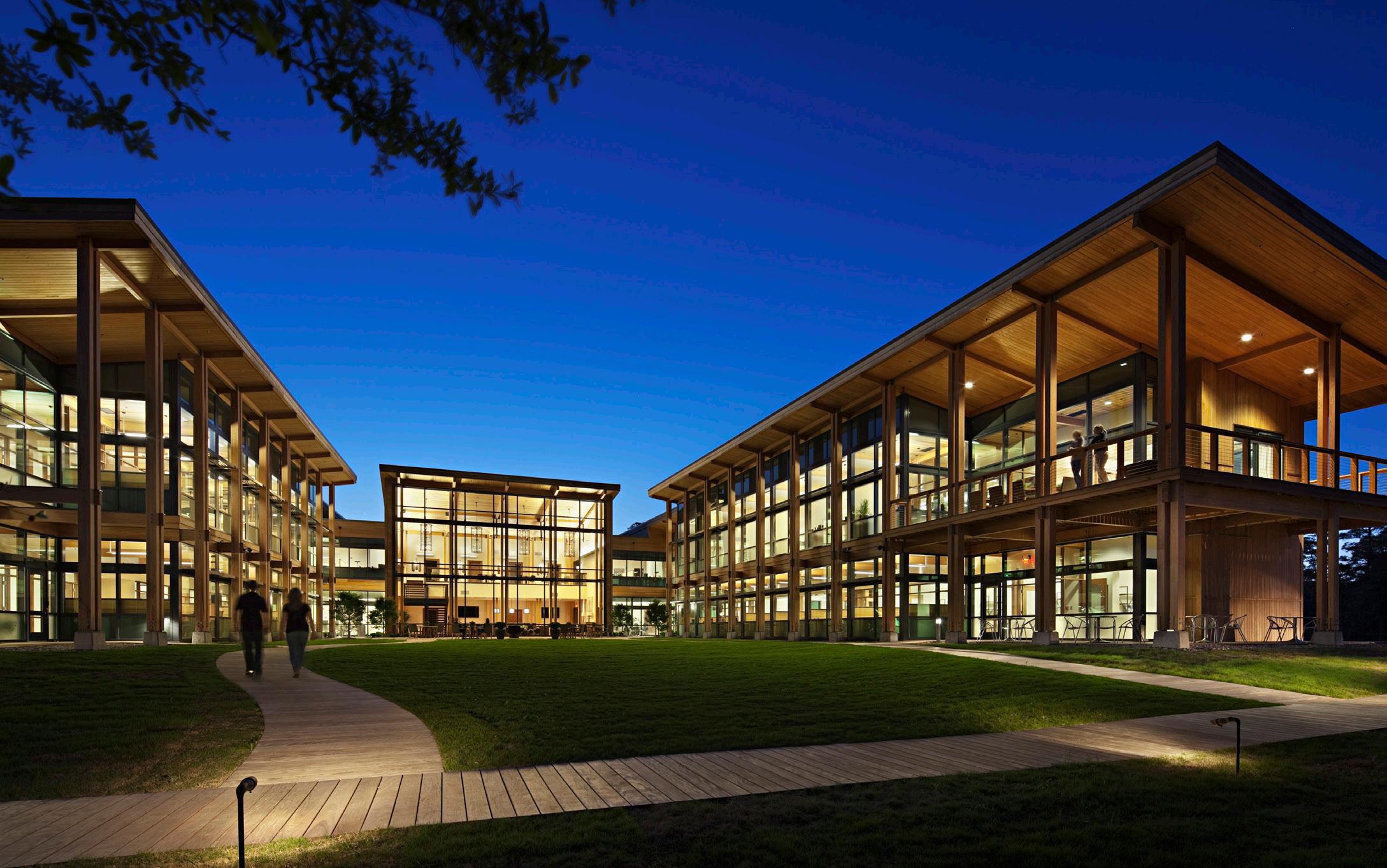 The key drivers of sustainability and connectivity informed the design. Sustainable strategies include tree preservation for shading and enjoyment, high performance mechanical systems and glazing, daylighting, and a retention pond for stormwater management that doubles as a popular site amenity. Sheltered walkways, boardwalks, and running trails connect site elements and workspaces, while a variety of outdoor areas serve as flexible work and gathering areas.