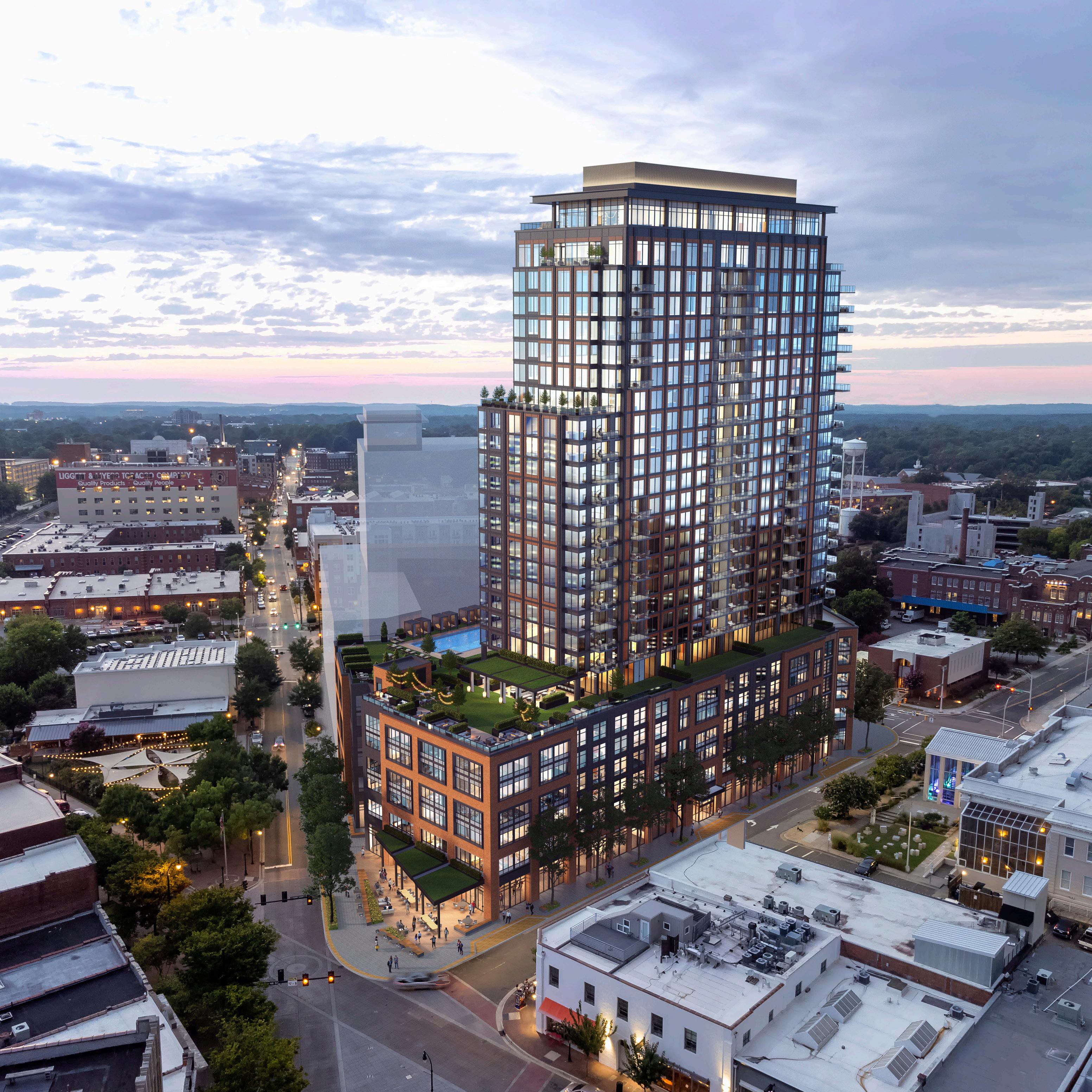 This mixed-use development is a 670,000 SF, 27-story development located at one of the most prominent sites in downtown Durham. The project consists of a 380-space parking podium with one level below and five floors above 25,000 SF of grade level retail. The parking is wrapped on two sides with 70 market rate apartment units and topped with a lap pool, fitness deck, fitness center, co-working lab and resident lounge. A tower with a mix of 118 apartments and 54 condominiums rises above the podium and is topped with an amenity floor comprising additional lounges, display kitchens, gaming areas and spacious outdoor terraces for both owners and tenants.