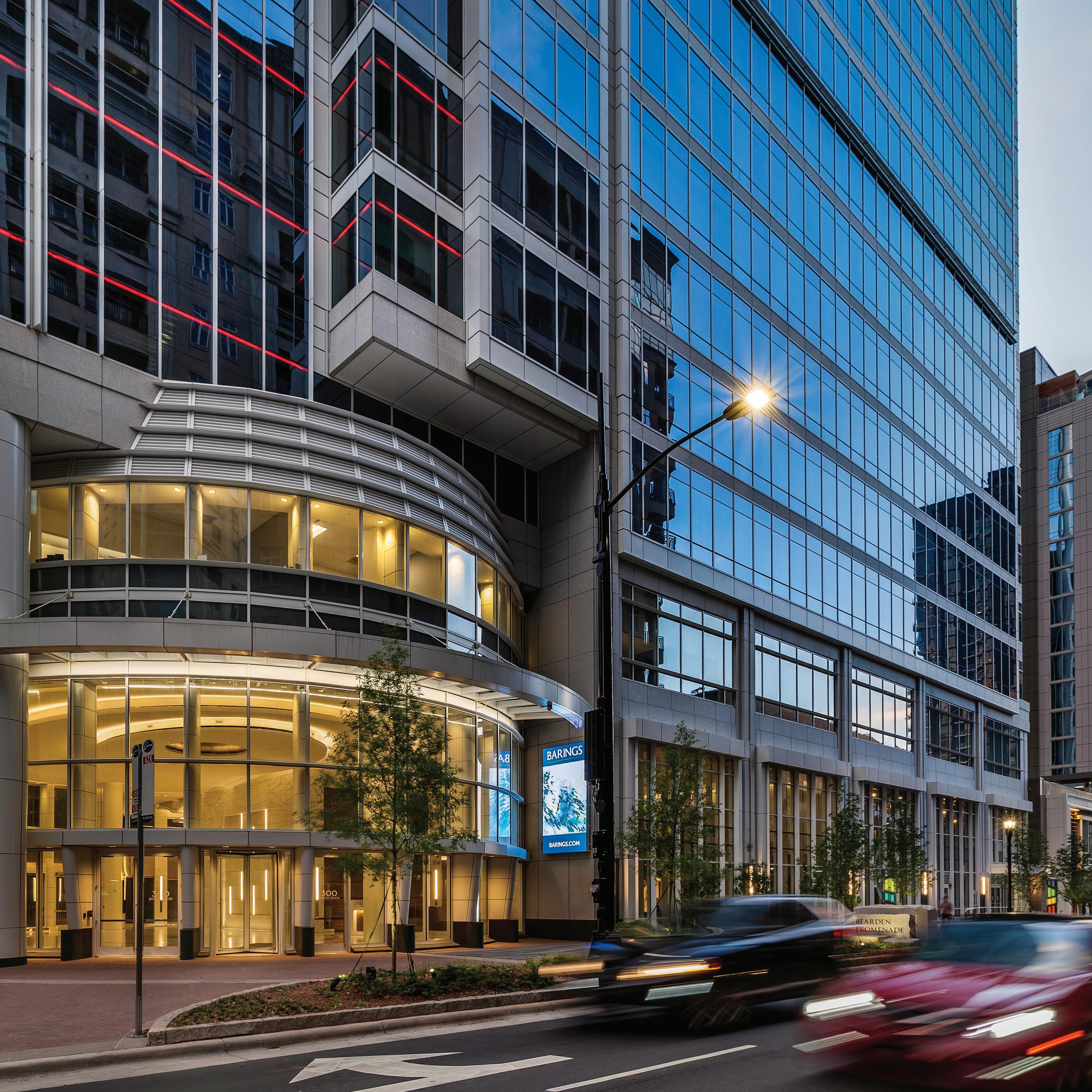 This 25-story office tower has a graceful, sweeping form that adds a distinct contemporary profile to Charlotte’s skyline. The tower, which overlooks a downtown baseball stadium and city park, features Class-A office space and street-level retail.