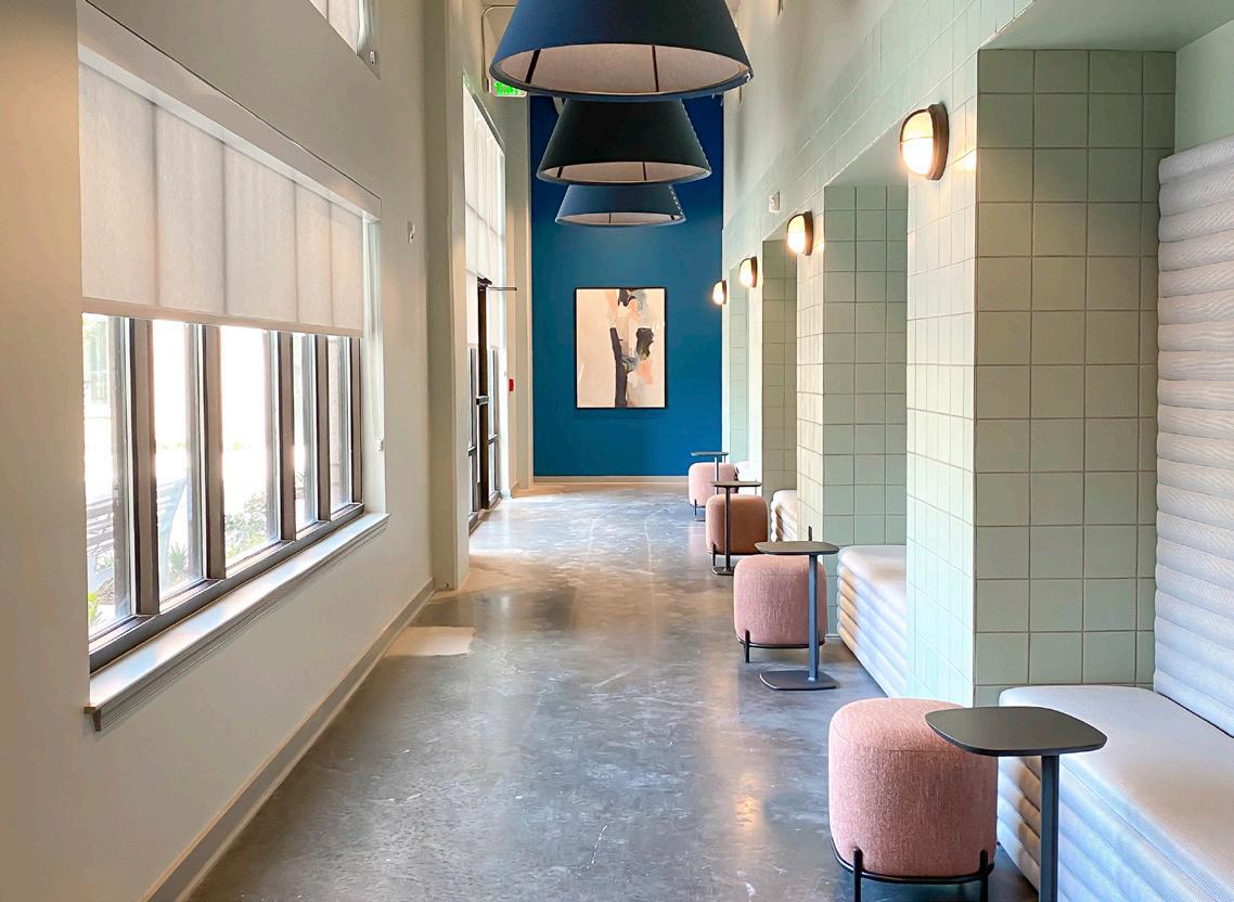 The interiors feature high-end finishes with bold, student-friendly geometric patterns. A rooftop soaking pool, fitness spaces, study lounges, and built-in niches and gathering spaces provide student space outside of the residence areas. The amenity corridor recreates the experience of meandering alleyways; porcelain tile slabs lining the corridor resemble the color of wrought iron and the texture of plaster. Handmade wall tile installations create a sense of movement and mimic the growth of a native creeping fig, while a vaulted concrete and structural glass paver system provides filtered light from above, reminiscent of dappled light shining through a tree canopy on a leisurely garden walk.