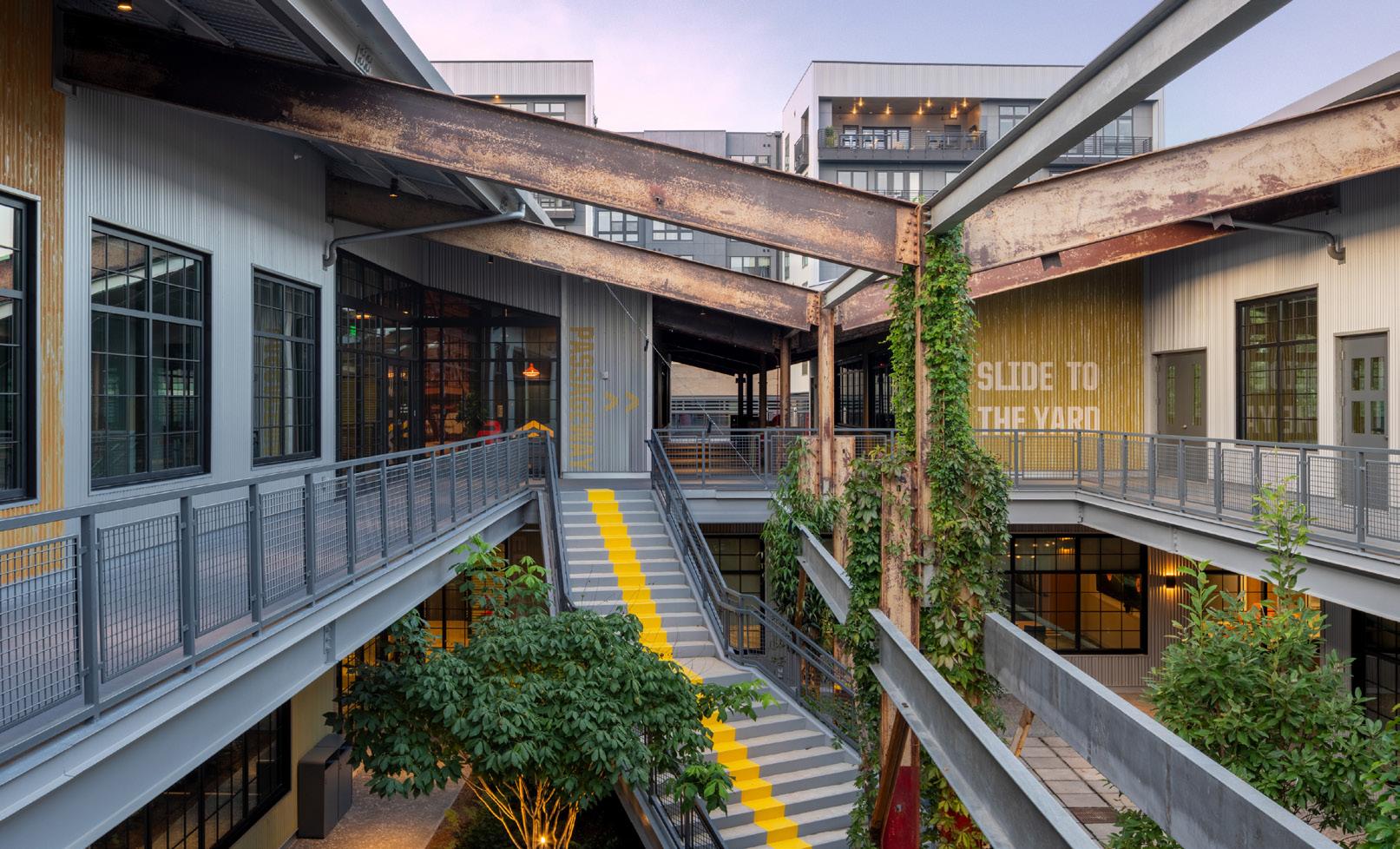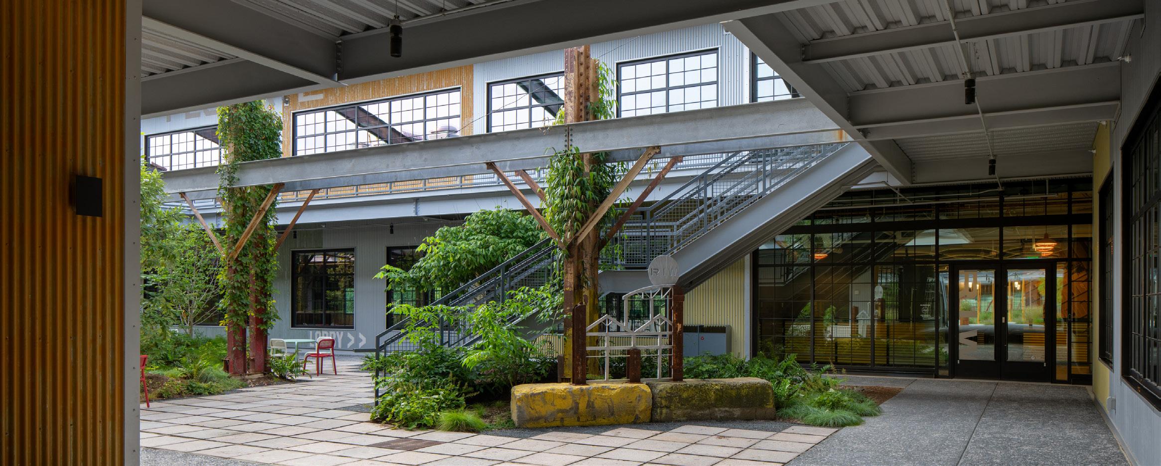 in which steel was once fabricated. The first floor now houses event space, restaurant, and retail, while the second floor is Class-A office space accessed by an exterior monumental stair. The design retains the architectural character of the exposed roof structure and replaced a lean-to addition with a terrace.