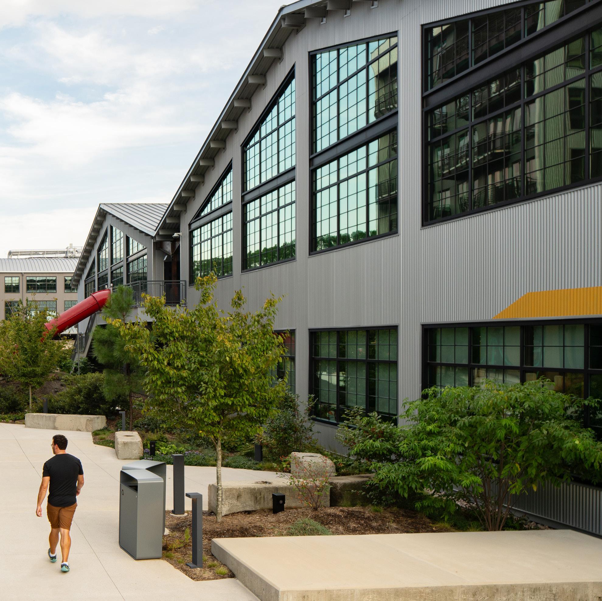At the time, the company’s location far northeast of downtown Raleigh was ideal for industrial uses. Due to the unique topography of the site, the buildings nestled a story below the welltraveled street above; dense vegetation further shielded the site from view. As the years passed, the site became grittier, the landscape grew wilder, and the manufacturing activity was downgraded to a recycling center.