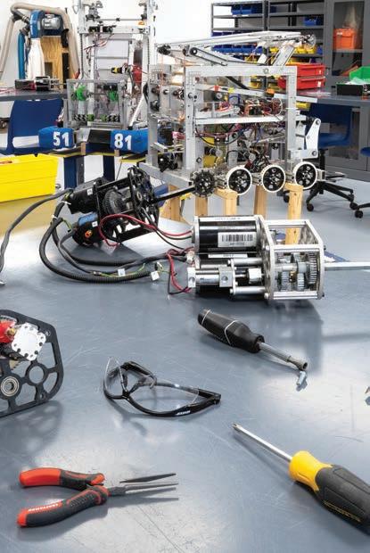 Upperclassmen design, build, and program an industrial grade competition robot and manage a budget of over $50,000 as well as allocate time and money to various service initiatives run by the robotics team.