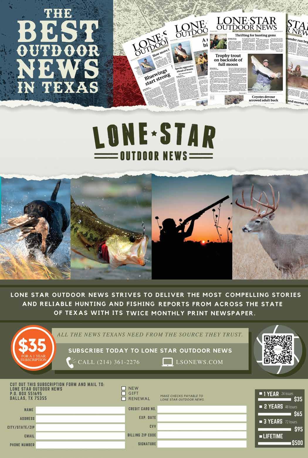 Advertising: Call (214) 361-2276 or email editor@lonestaroutdoornews.com to request a media kit. For home delivery subscriptions www.LSONews.com(214) 361-2276