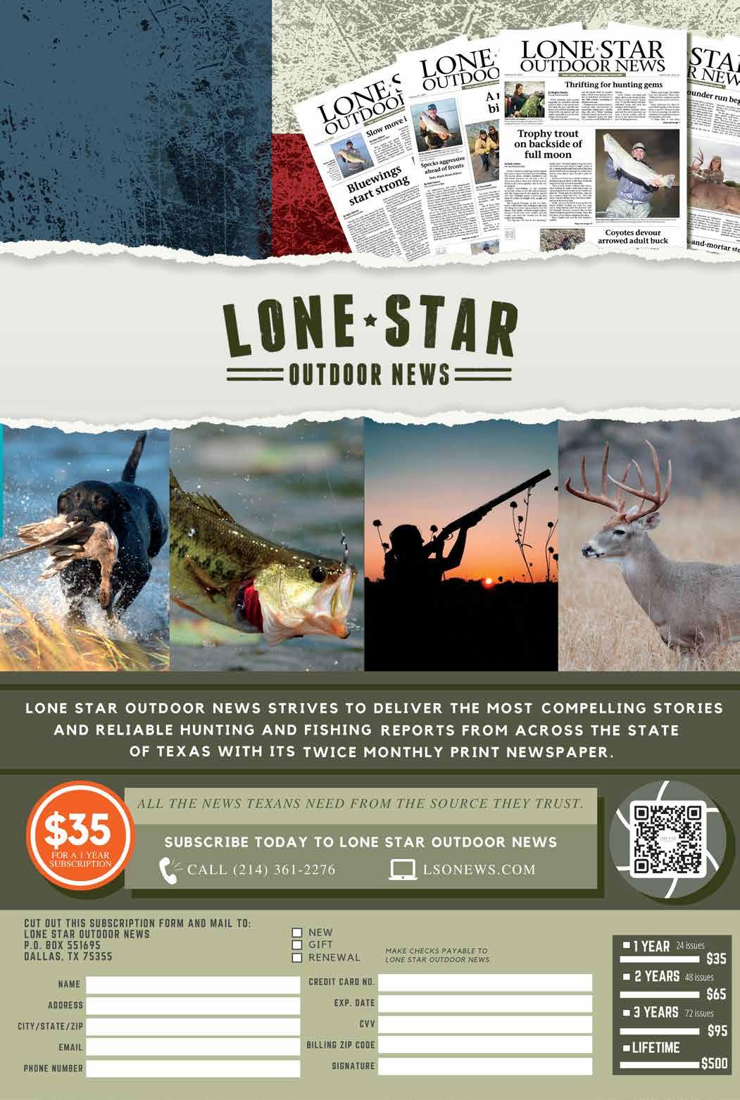 For home or office delivery, go to LSONews.com, or call (214) 361-2276, or send a check or money order to the address below. Lone Star Outdoor News, ISSN 2162-8300, a publication of Lone Star Outdoor News, LLC, publishes twice a month. A mailed subscription is $35 for 24 issues. Newsstand copies are $3, in certain markets copies are free, one per person.