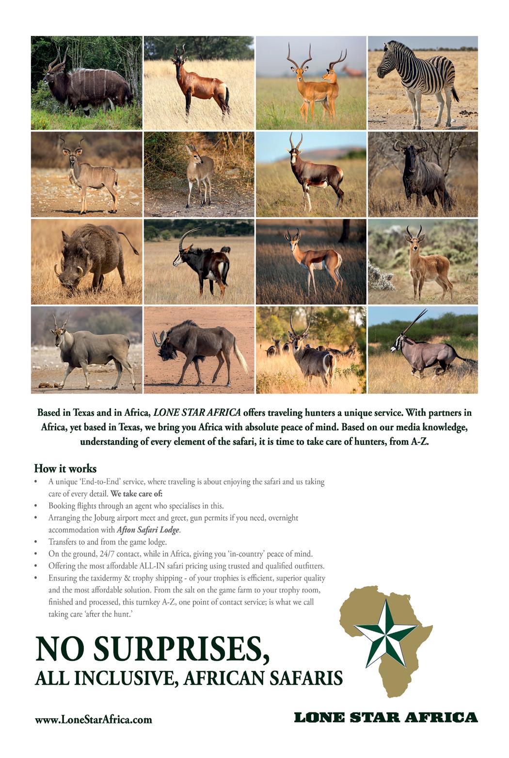 Hunting: All Inclusive - No surprises Includes: Animals, daily rates, taxidermy, shipping home. To find out more: LONESTARAFRICA.COM