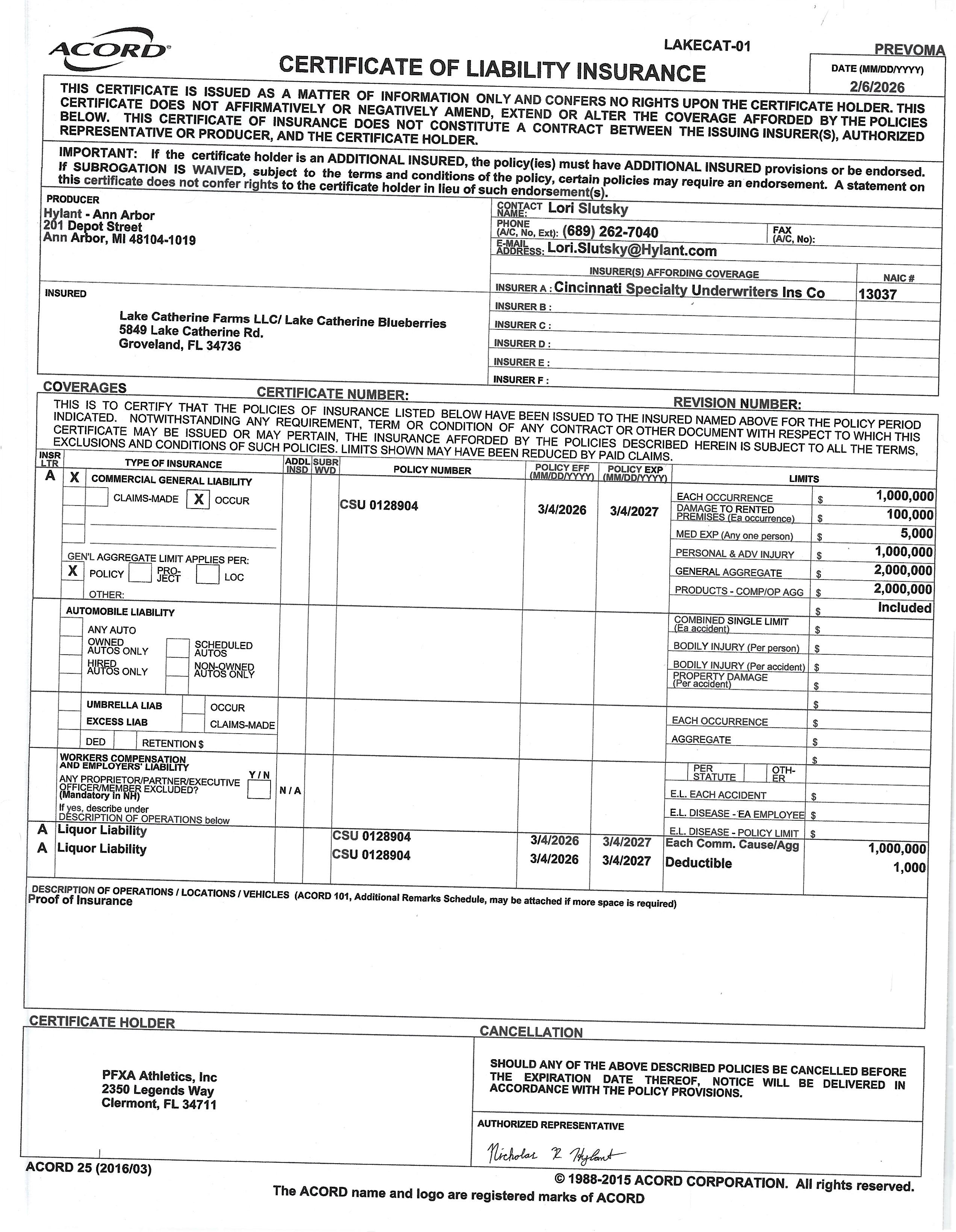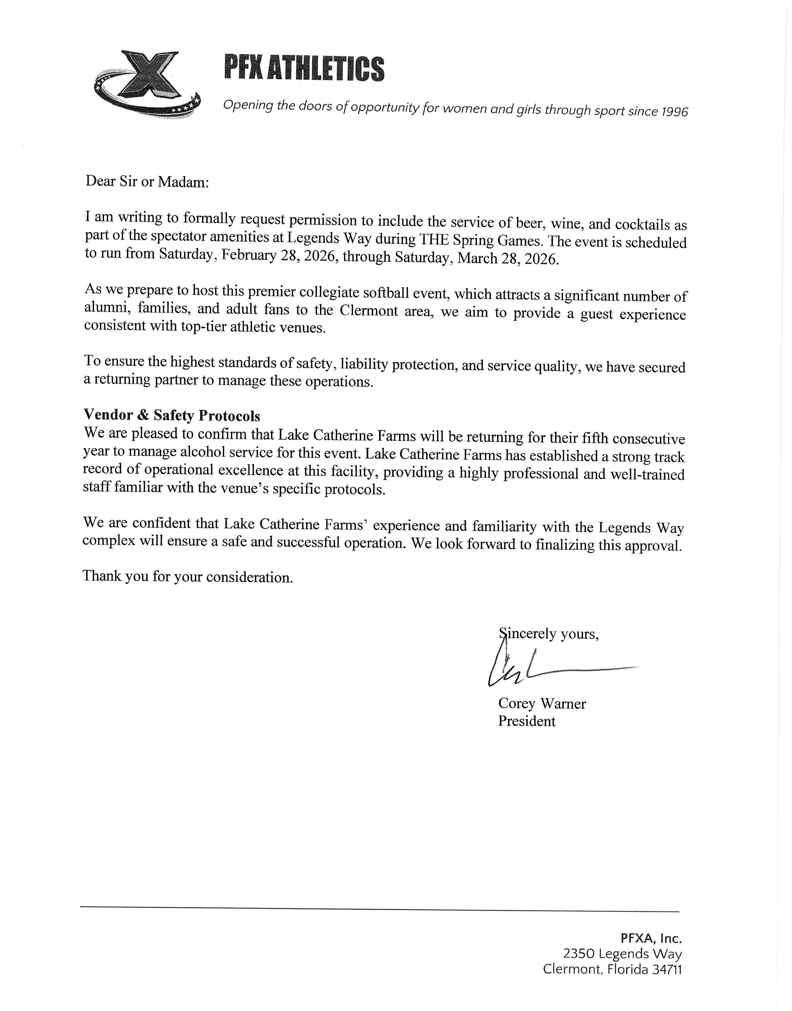 It is recommended that PFX Athletics, through Lake Catherine Catering and Events, be allowed to sell and serve beer, wine, and alcohol at Legends Way Softball Complex during the 2026 Spring Games starting Feb. 27, 2026 and ending by April 1, 2026.