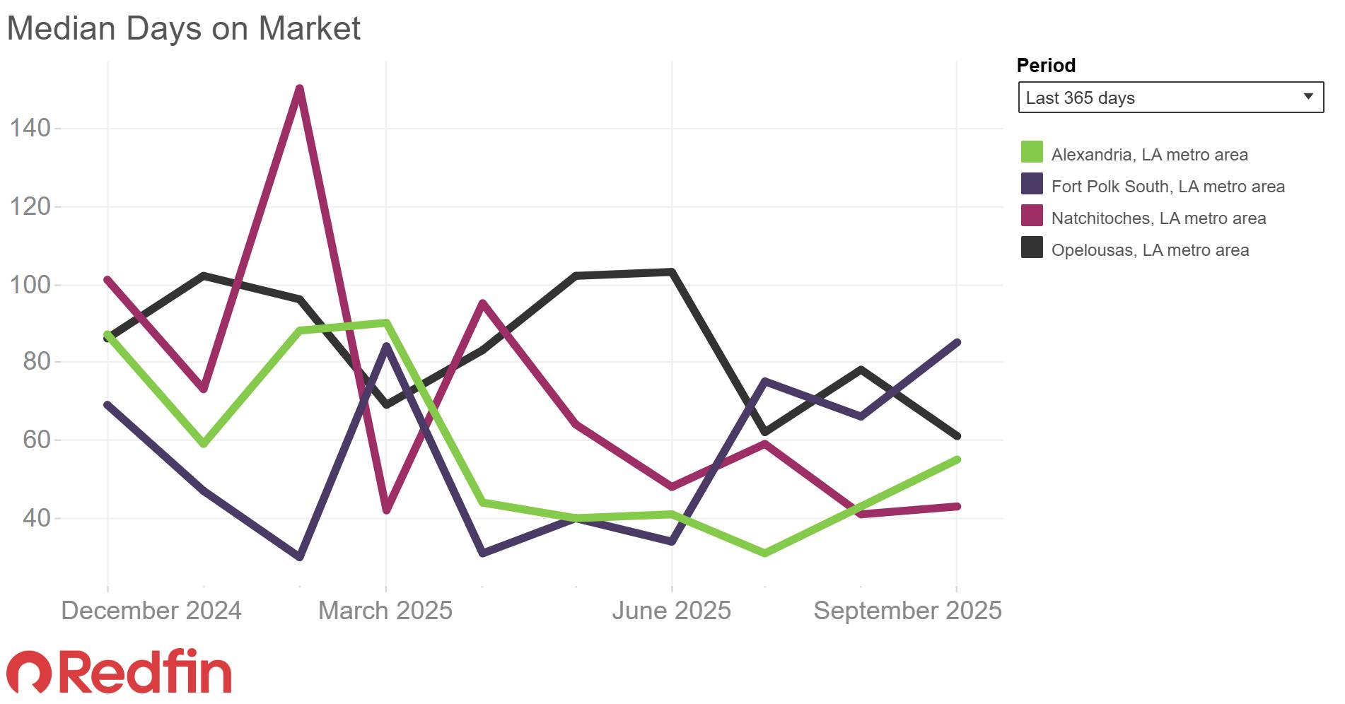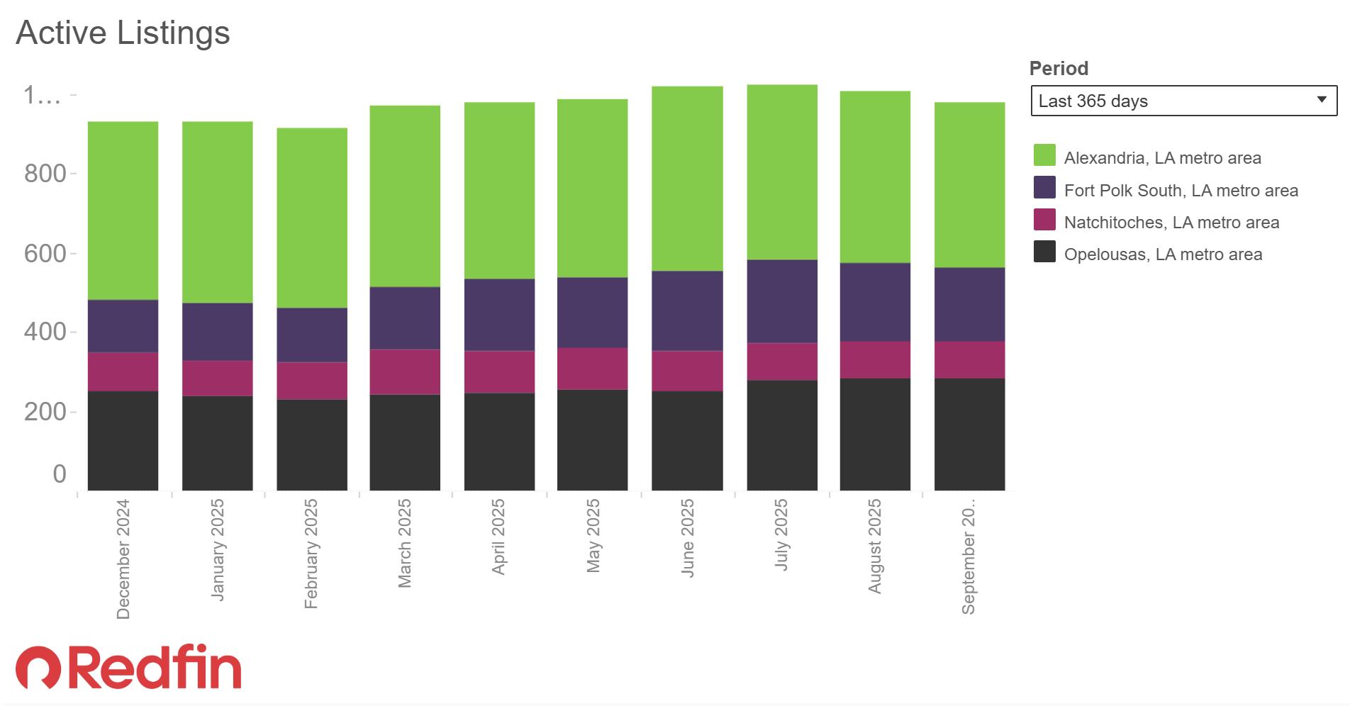 The graphic shows the number of new listings for Alexandria, Leesville, Natchitoches, and Opelousas over the past year. Data Source: Redfin.com. Retrieved October 31, 2025