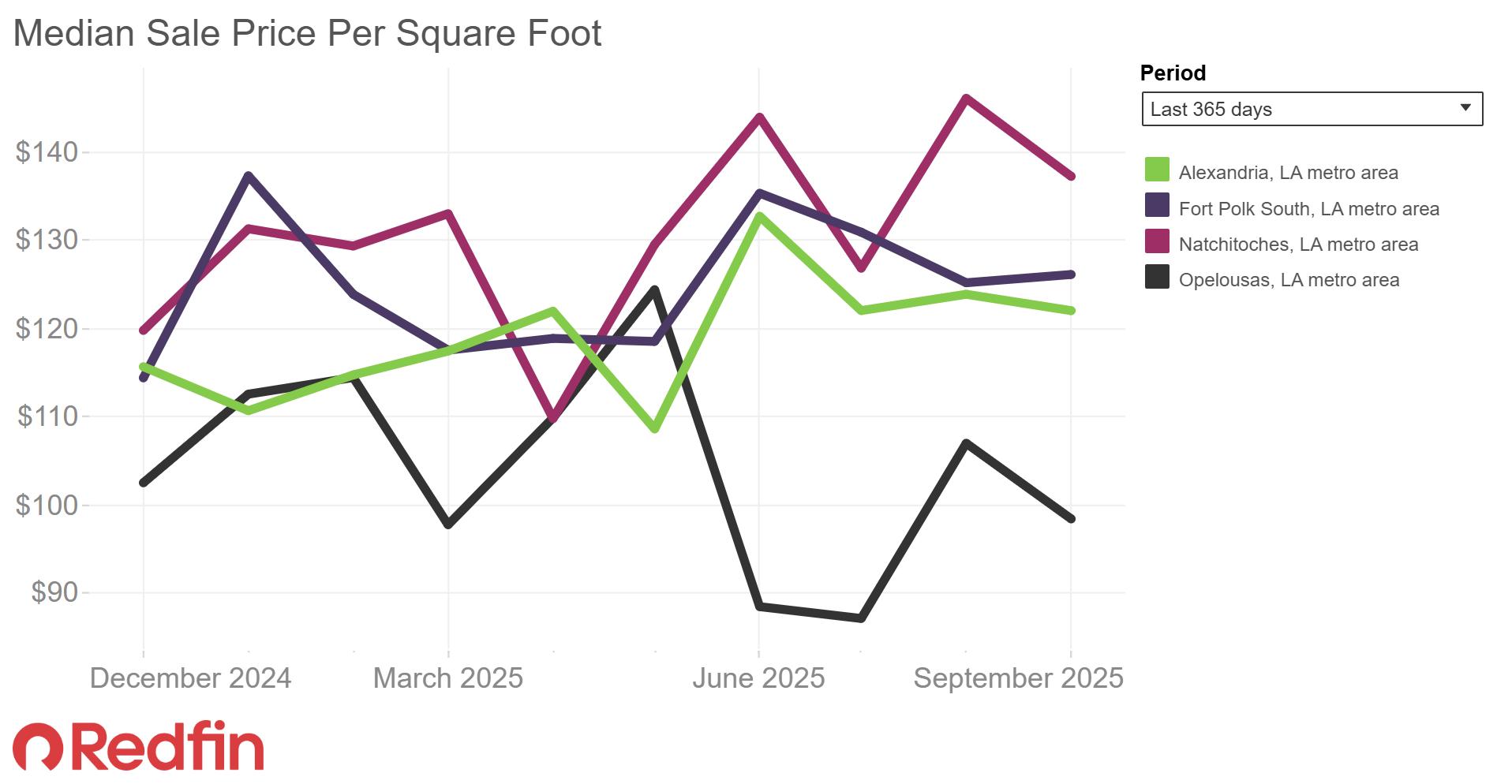 The graphic shows the median sales price per square feet of houses for Alexandria, Leesville, Natchitoches, and Opelousas over the past year.