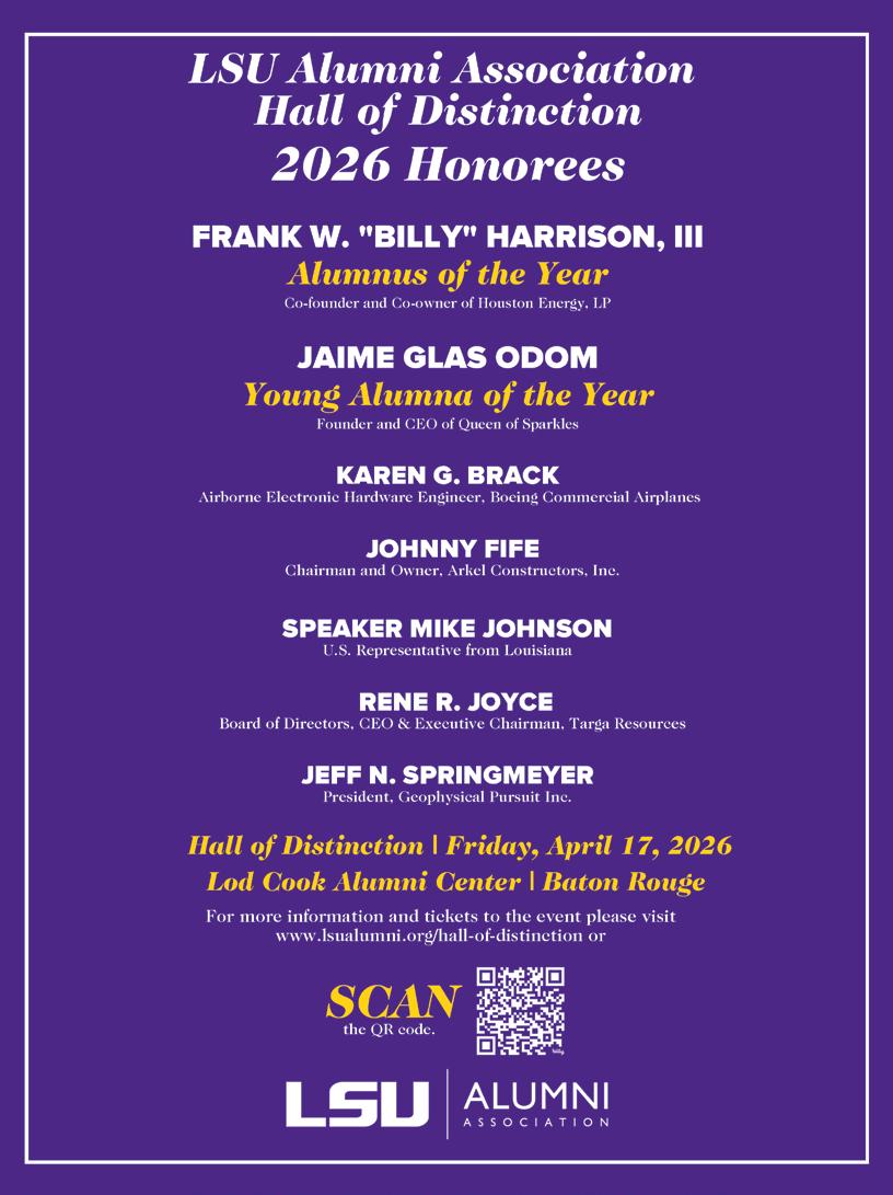 I am excited to announce and congratulate this year’s LSU Alumni Association Hall of Distinction honorees, including Frank W. “Billy” Harrison, our 2026 Alumnus of the Year; Jaime Glas Odom, the 2026 Young Alumna of the Year; Karen Brack; John H. “Johnny” Fife; U.S. Speaker of the House Mike Johnson; Rene Joyce; and Jeffrey Springmeyer.