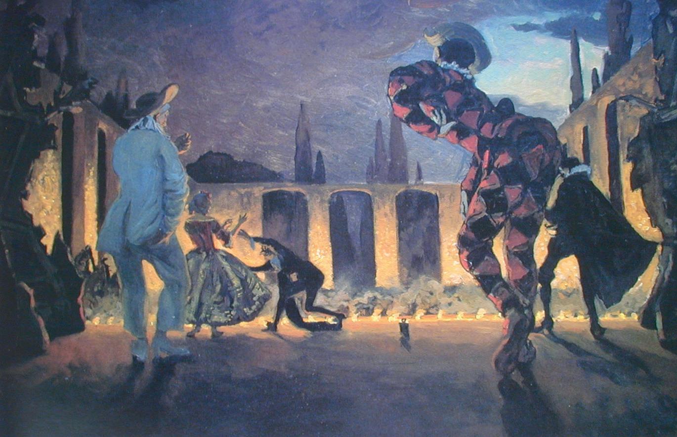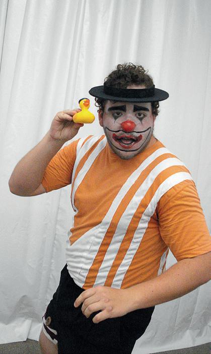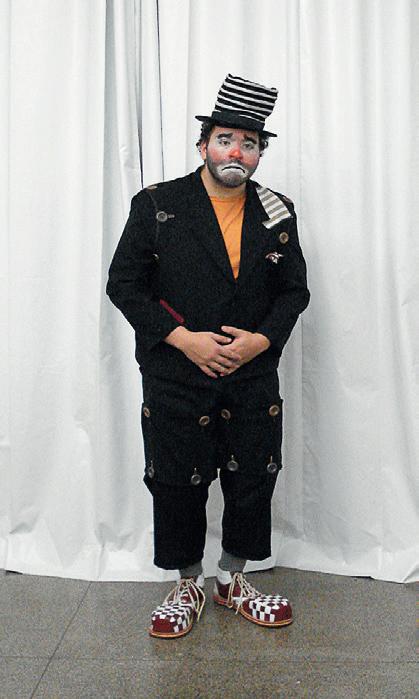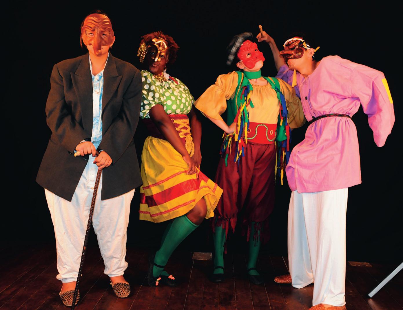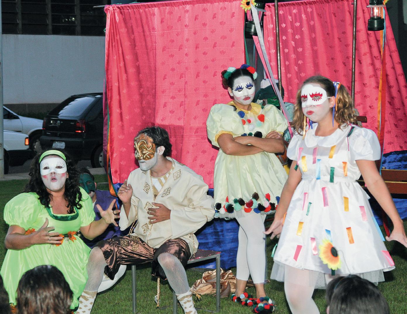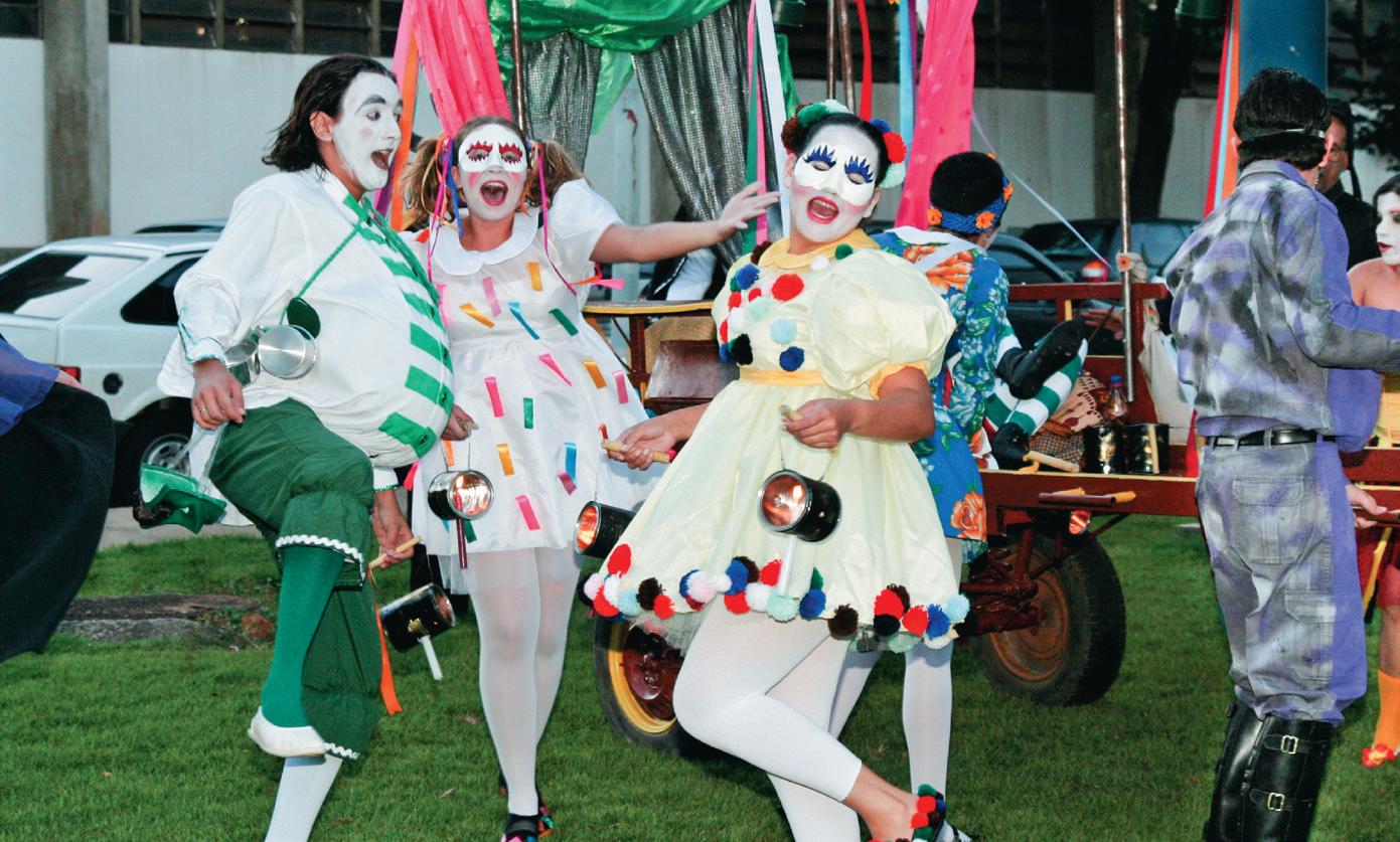 edifício do complexo das artes – CEN, composto de cenas da comédia universal. Os alunos confeccionaram máscaras, figurinos e montaram uma carroça para a apresentação Alunos do noturno de Técnicas de Suportes Cênicos 1 e 2 e, Técnicas de Interpretação 1 e 2