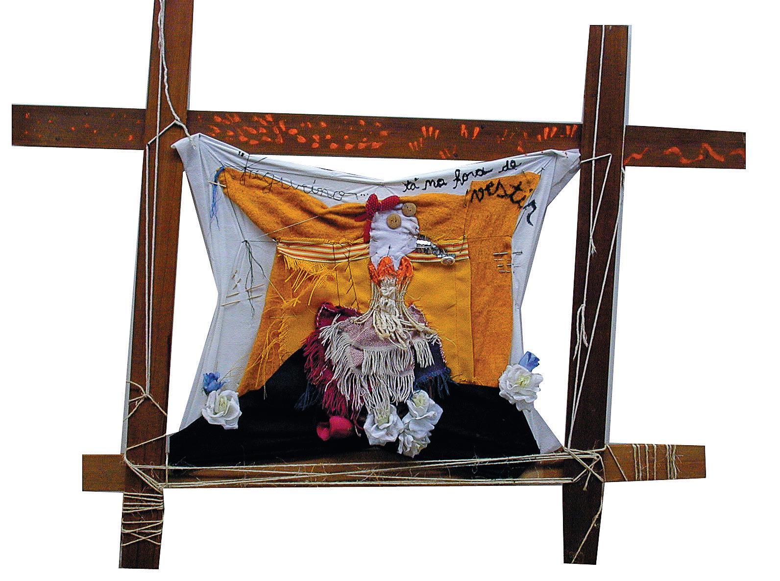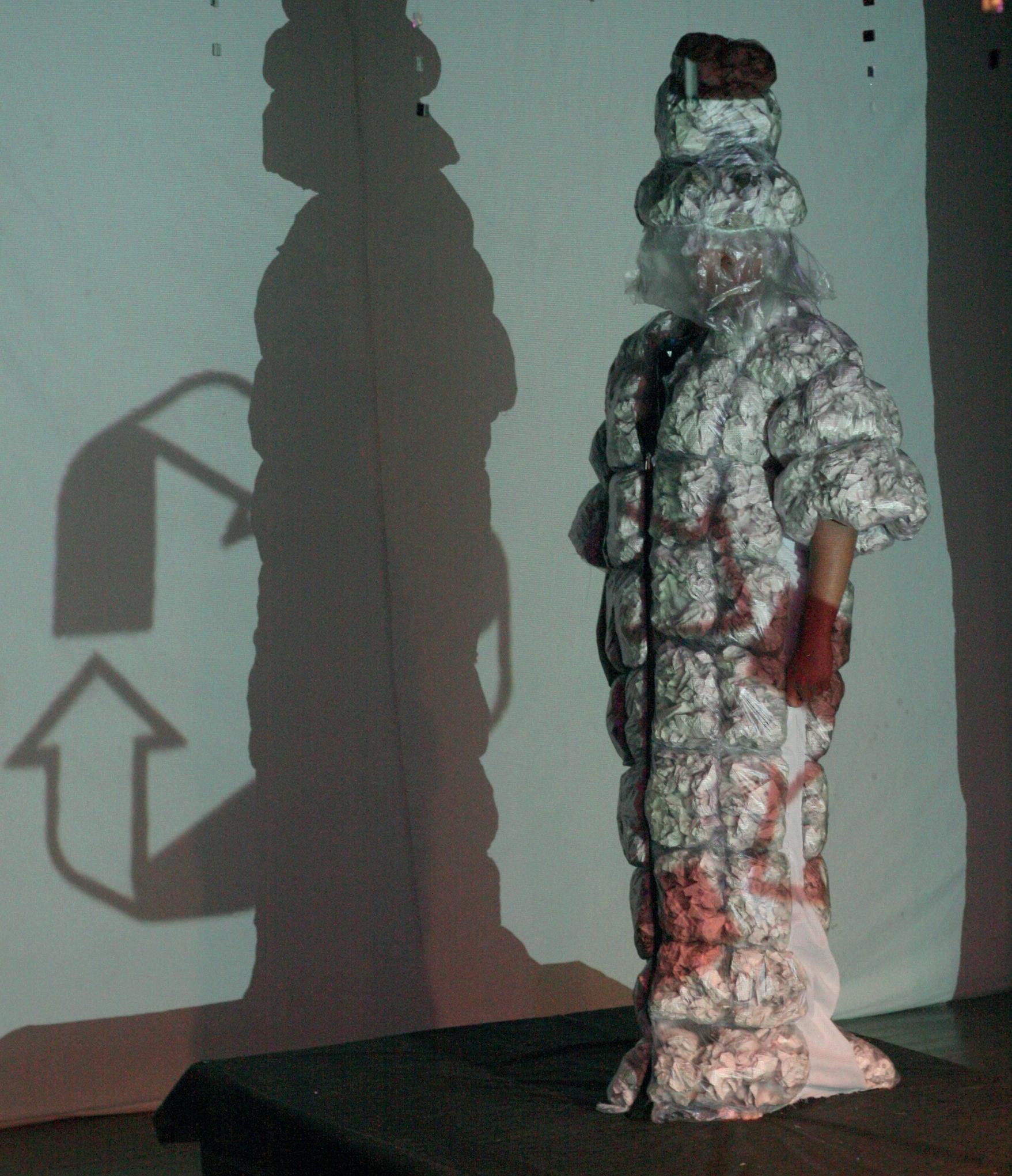 Sinopse do trabalho: Construção de um figurino que explora materiais recicláveis para representar o texto Uma boneca no Lixo, escrito em 1998 por Cristiane Sobral. O figurino interno é baseado no pretinho básico, do filme Bonequinha de Luxo, construído com faixas de rua e fitas cassete tramadas como tecido; a roupa externa é feita com sacos de plásticos costurados que são estufados com jornal.