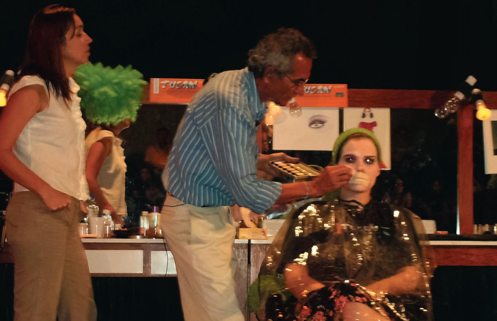 Meu objetivo sempre foi ampliar e divulgar uma metodologia de criação e produção que nos leva ao domínio do processo: da ideia inicial ao produto final, com foco no artista que busca orquestrar a totalidade criativa. Esta formação está ligada a um trabalho interdisciplinar, colaborativo, de Cenografia, Indumentária e Iluminação para a produção e execução de projetos cênicos no CEN. Em parceria com alunos e professores das disciplinas de Interpretação, Montagem e Projetos de Diplomação, fizemos vários trabalhos, como os que ilustram este livro. Várias vezes dividi as turmas em grupos distintos para experimentarmos a prática da totalidade cênica. As turmas tiveram a oportunidade de criar e produzir cenários, figurinos e iluminações, trabalhos que viram encenados e, desta maneira, puderam entender os meandros da produção teatral. Pudemos vivenciar as relações entre os criadores e como as ideias convergem-se, ao final, no espetáculo. Esta metodologia é resultado de 13 anos de academia somados aos muitos anos de experiência profissional com artes plásticas e cênicas em suportes multimidiáticos. A prática profissional em encenação foi marcada pela participação em projetos de minisséries da TV Globo, na equipe de Walter Avancini: o mestre da cenografia Irênio Maia, o mago da maquiagem Vavá Torres e o da iluminação Peter Gasper, profissionais sem preconceito com o meio para o qual produziam e produzem – teatro, cinema, TV, carnaval, boate ou monumentos e jardins – e que tinham em comum o prazer de experimentar materiais, pesquisar a técnica e trabalhar com controle de tempo e qualidade na produção.