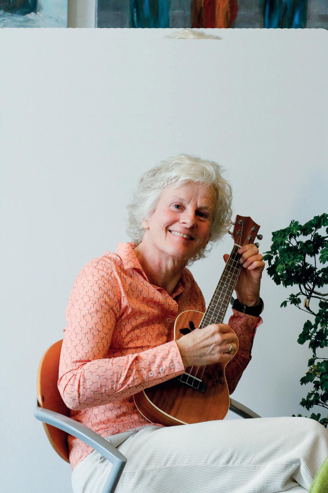 “Ik heb een fors gehoorverlies, dus hoe doe je dat dan met muziek? Een zoektocht die mij uiteindelijk bracht bij de ukelele. Ik ben opgegroeid in een klein dorp en wij gingen iedere zondag naar de kerk. Daar mochten we dan echt voluit zingen. De dominees zeiden altijd dat ze het bijzonder vonden dat iedereen meezong. Voor mij achteraf belangrijk, want daar heb ik heel vrij leren zingen. En vooral dat het allemaal oké was. Ik speelde vanaf mijn tiende gitaar en heb dat een paar jaar gedaan. Als puber ben ik ermee gestopt en toen ben ik die vaardigheid eigenlijk helemaal verloren. Maar toch was de basis gelegd. Ik heb nog wel saxofoon geprobeerd en hoewel ik dat ontzettend leuk vond, was dit instrument voor mij te luid. Het werkte als aanjager op mijn tinnitus. Toch liet het bespelen van een muziekinstrument mij niet los en na een zoektocht kwam ik vier jaar geleden bij de ukelele terecht. Ik kan dit instrument tegen mijn lichaam aanhouden. Ik neem de ukelele letterlijk in mijn armen en kan deze zo met al mijn zintuigen waarnemen. Met mijn hart, met mijn adem, met mijn huid en… misschien ook wel met het onbenoembare. Het geeft een heerlijk gevoel. Ik heb samen met een paar anderen ook muziekworkshops gegeven voor mensen met gehoorverlies. Ik improviseerde daar met een bamboefluit. En ja, laat maar komen wat er komt, dan ontstaan vanzelf je eigen klanken. Een inspiratiebron voor mij is Evelyn Glennie, een wereldberoemde dove percussionist. Zij gaat heel erg voor het voelen van de muziek, voor het spelen met al je zintuigen. Bij gehoorverlies is het belangrijk dat je alle functies voedt, stimuleert en wakker houdt. Muziek maken is een prachtige manier om die vitaliteit te voeden. Het is zo'n mooie belevenis. Natuurlijk horen er soms belemmeringen bij gehoorverlies, maar dat maakt me niet uit. Dat is het leuke van dit avontuur aangaan: hetgeen ik niet goed hoor, dat ga ik onderzoeken. Dan vraag ik dat aan mijn ukeleledocent en gaan we het samen uitzoeken. Ik kan het stemmen bijvoorbeeld niet horen, daar gebruik ik een stemapparaatje voor; maar ik neem het wel waar als het niet klopt. De oefening is ook om te leren vertrouwen op wat je waarneemt. Dat is een prachtige reis. Ik zie de obstakels als een kans om me verder te ontwikkelen. Als het op deze manier niet kan, hoe dan wel? Met gehoorverlies wordt er vaak op gefocust dat je van alles niet kunt horen, maar er is ook heel veel wat je nog wel kunt horen! Naar die klanken luisteren is een fantastische ervarings- en geluidswereld. De ukelele is wat mij betreft echt een droom”.