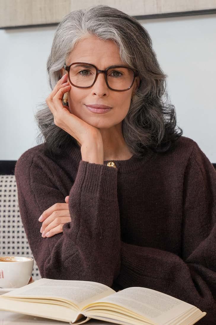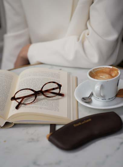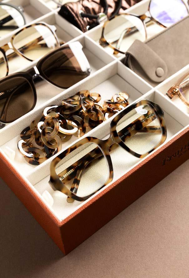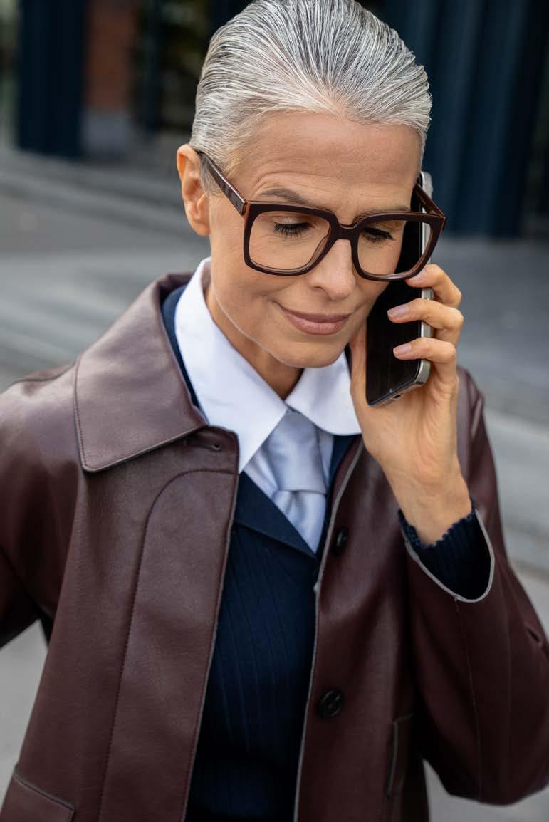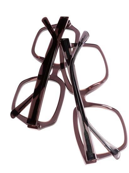 For winter we see a lot of 2025 Pantone colour of the year Mocha Mousselike colours. Warm brown shades combined with soft orange, caramel and espresso. But there are also many shades of deep red, violet, mauve, purple and darker blue shades on trend. We developed a large collection of luxurious readers and acetate framechains in both palettes of candy colours. Our Rum Runner, as shown on the opposite page, is one of the important colours for now, here in a very easy Eyeknow model. Besides the new colours we also welcome pretty new products. New is our Eyeclass, a slightly smaller rectangular frame that suits many women. Available in many elegant hues. And of course in our all-time favourite Greyvanna.