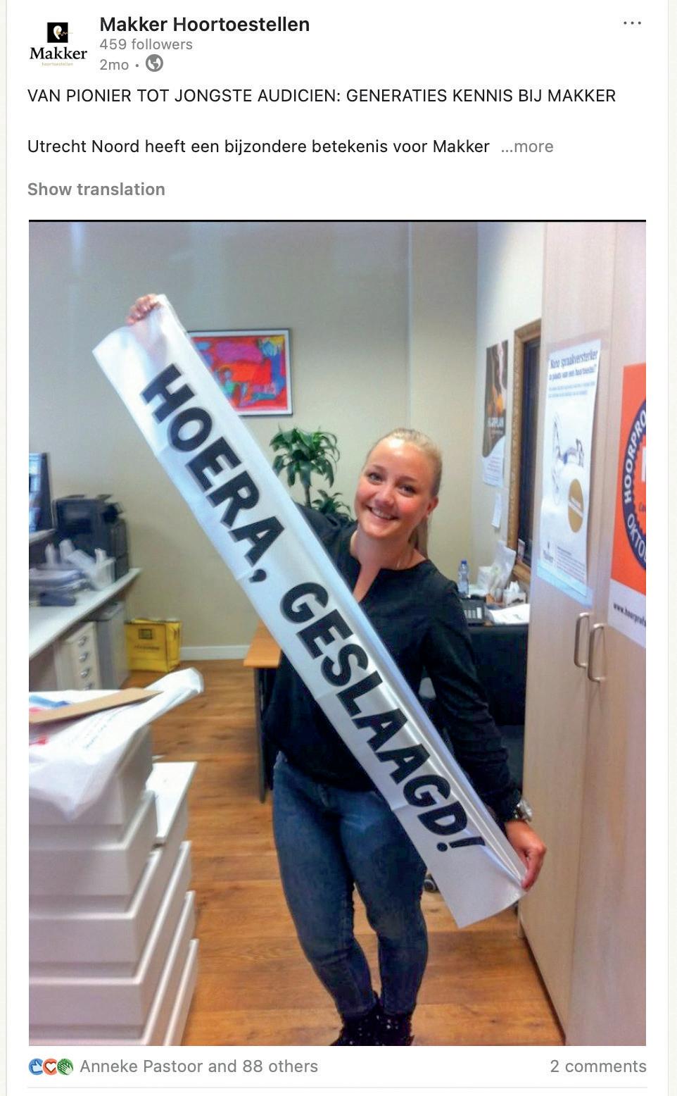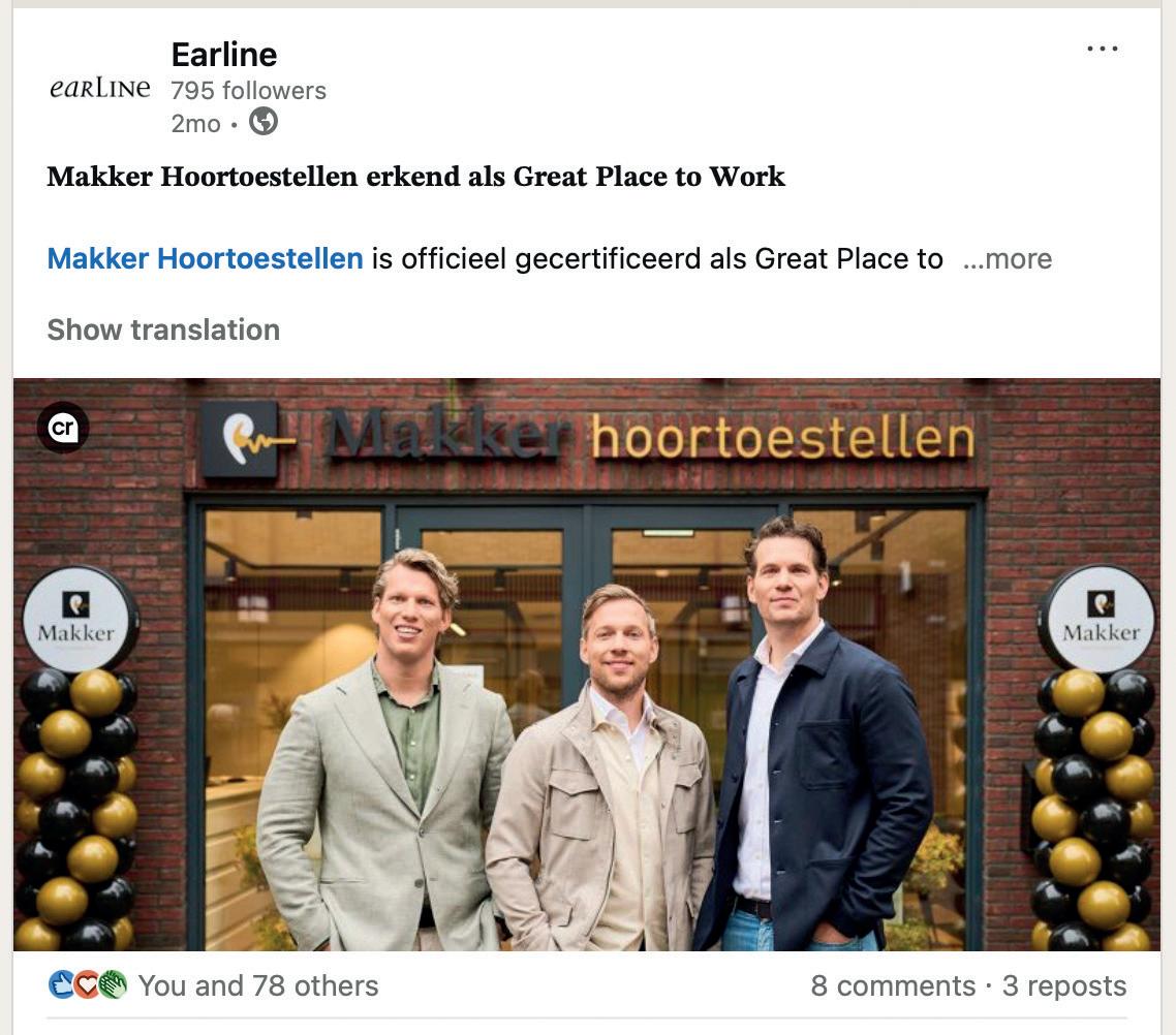 Uit onafhankelijk onderzoek onder onze medewerkers scoren we op werkplezier, waardering en ontwikkelingsmogelijkheden een indrukwekkende 9,2! Onze collega’s waarderen vooral de vrijheid om klanten écht te helpen – zonder verkoopdruk – en de regelmatige bijscholing via onze eigen Makker Academy. Deze strategie betaalt zich uit: van de nu in totaal 100 collega’s zijn er maar twee weggegaan, die ook nog eens een heel andere branche ingingen. Daar zijn wij trots op! Nog nooit heeft een collega uit zichzelf ons verlaten voor een andere audiciensbedrijf, en dat willen wij graag zo houden! Ook werkt Makker niet met een concurrentiebeding. Wij geloven erin dat als iemand bij je weg wilt, je op zoek moet gaan naar de oorzaak. Behoud van onze collega’s staat op één, recruitment niet. We geloven dat mensen die echt bij ons willen werken, ook de