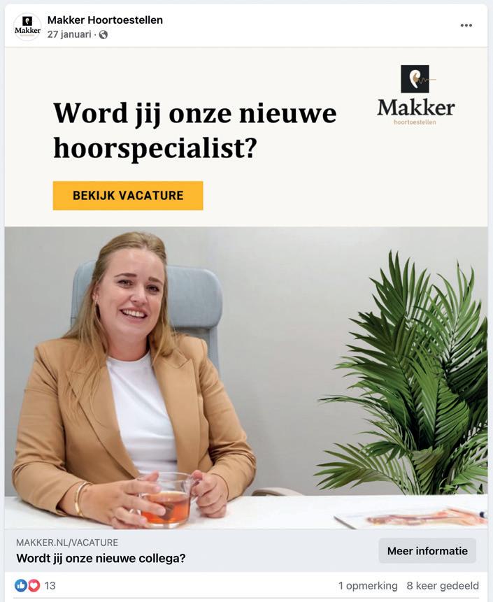 gesteld. Klanten reageren heel goed op de ervaring die ik daarmee heb. Bovendien zorgde het ervoor dat ik mijn eigen slechthorendheid beter kon accepteren. Dat vond ik heel mooi; ook om te laten zien dat slechthorendheid niet alleen maar voorkomt bij ouderen. Natuurlijk hebben wij veel oudere klanten, maar ook baby’s van zes weken oud, mensen van 100 - en alles wat ertussen zit. Dus het is voor klanten ook leuk om te zien dat ze niet meteen bejaard en afgeschreven zijn op het moment dat ze een hoortoestel nodig hebben”.