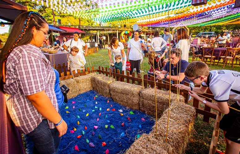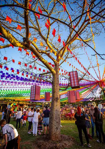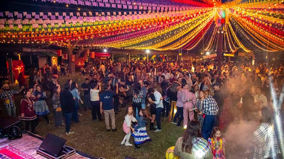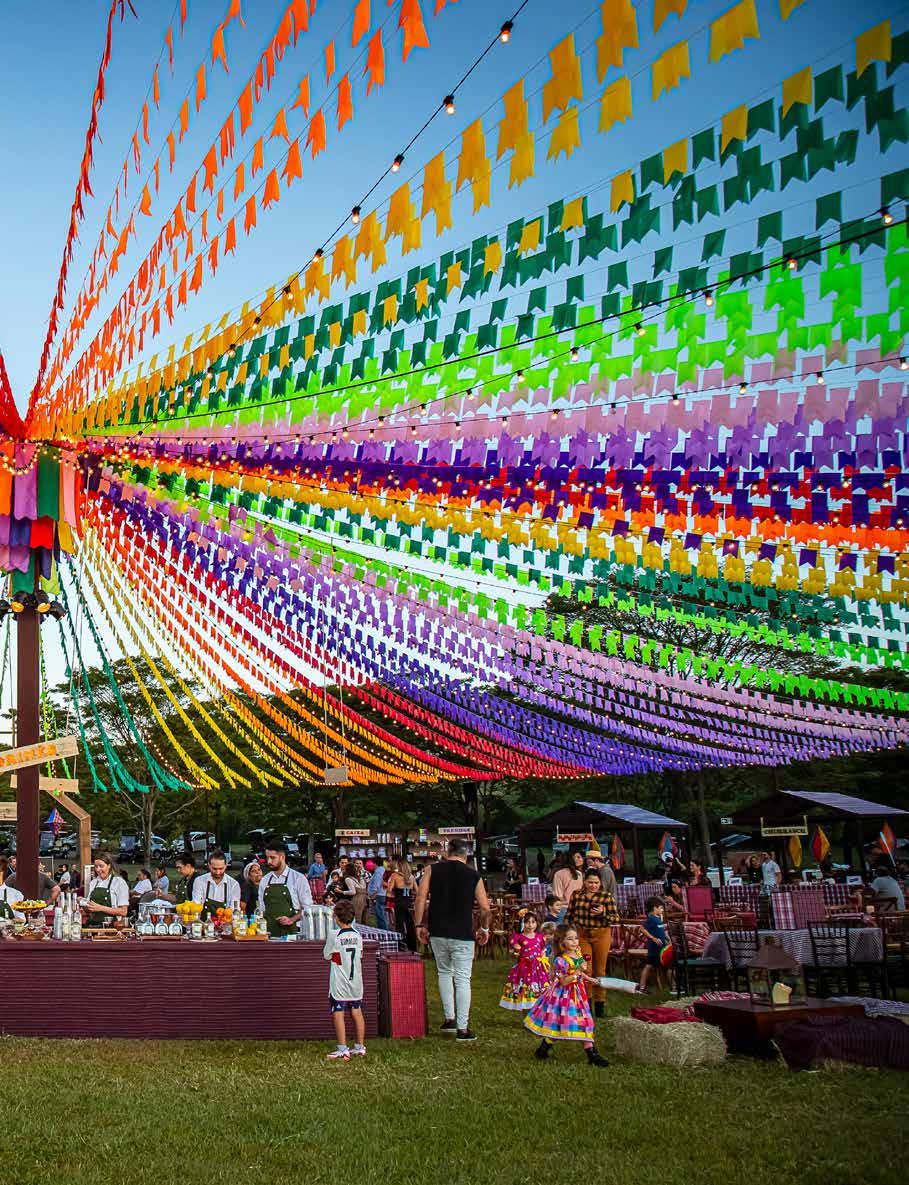 Com cores únicas e intensas, o projeto foi assinado pela expert Bossa Nova e resgatou a tradição das festas tradicionais nordestinas. O teto formado por bandeirolas criou um degradê lindo na Sede Hípica. As barraquinhas de comidas e brincadeiras foram decoradas uma a uma com diferentes estampas de xadrez e plaquinhas de madeira. O bar central superespaçoso foi desenvolvido para servir a todos os convidados. Algumas mesas tiveram o décor de feno para dar aquele toque rústico e as lanternas revestidas de xadrez complementaram a decoração. Ainda havia lindos espaços instagramáveis escolhidos para registros de fotos e exposição de elegantes carros. Enquanto os maiores se divertiam, a meninada pôde brincar com atrações como pescaria, argola, touro mecânico e outros. No Espaço Kids, não faltaram os infláveis gigantes com pura diversão em um ambiente seguro e supervisionado pelos educadores para os pequenos.
