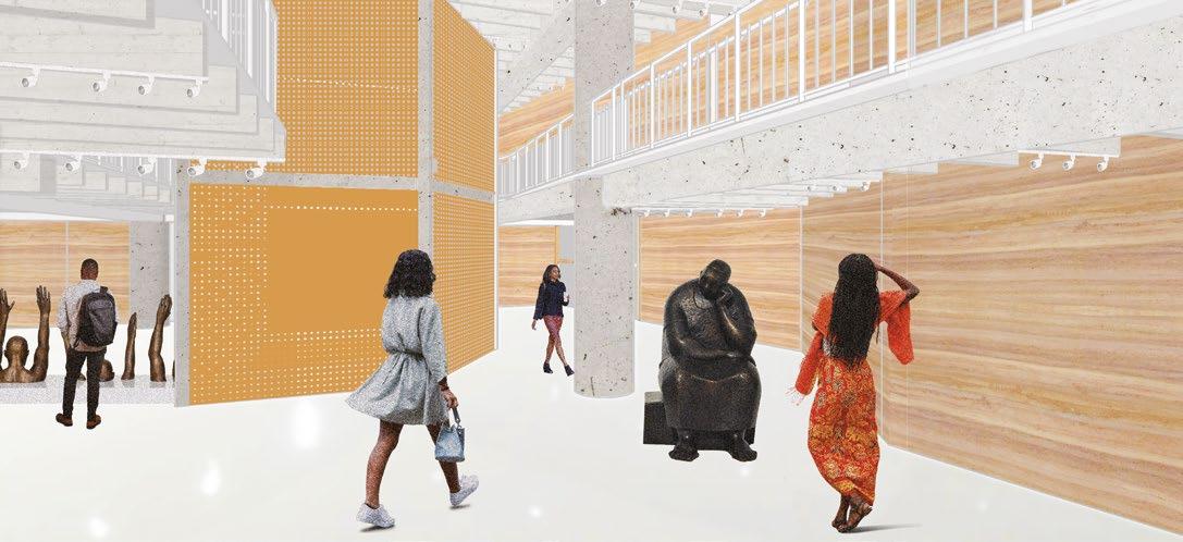 galerias de lojas com mezanino se permeiam entre pergolado e uma marquise, grafitis finalizam a fachada para proporcionar maior contato com a cidade e história do local, e árvores surgem entre os pequenos blocos para criar a sensação de estar dentro de uma praça e não ser uma área fechada a cidade e sim parte dela, para ser convidativa a permanência da população nessas áreas coletivas de lazer.