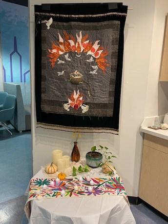 The holiday season can be especially difficult for families who have lost a child. In early November, the Women and Children’s Bereavement Committee held a “Blue Holiday” group to offer families a space to remember their child and acknowledge sadness and grief during this season of celebration. This group gathered for reflection, music, a therapeutic art process and a conversation about coping with the holidays as a grieving parent. As families entered The Zone, Joseph Cooper, music therapist, and Katie Rubino, music intern, provided calm environmental music. While caregivers engaged in an open discussion and blessings and a candle lighting ceremony, Abby Patch and Katie Messina, ICU Certified Child Life Specialists, provided various hands-on activities to process their sibling’s death such as writing a note to their sibling, creating holiday garland with our shared feelings, and decorating ornaments to bring home. This provided an opportunity to share memories and feelings about their loss and how they celebrate their sibling during the holidays. In addition, Sophia Gutierrez Osuna and Kyla Ohayon, art therapists, facilitated the creation of a collective quilt, each square honoring and telling the story of their child. As a collective, we were able to provide families a gentle gathering of remembrance of hope during this season of celebration.