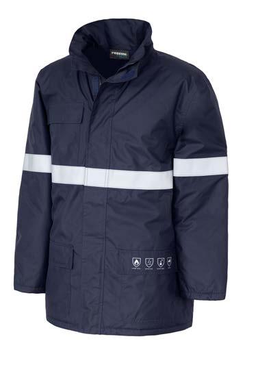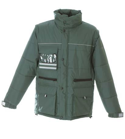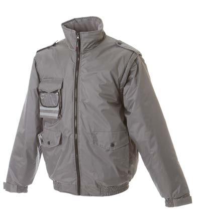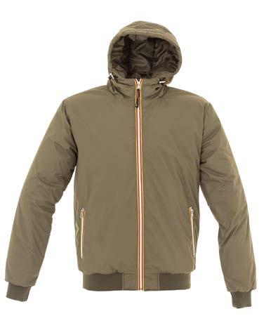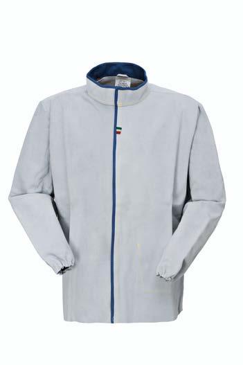 Rinforzo sulla parte posteriore del collo con fascia parasudore interna. Collo chiuso con due bottoni, polsi in maglia elastica. Spacchetti laterali al fondo.