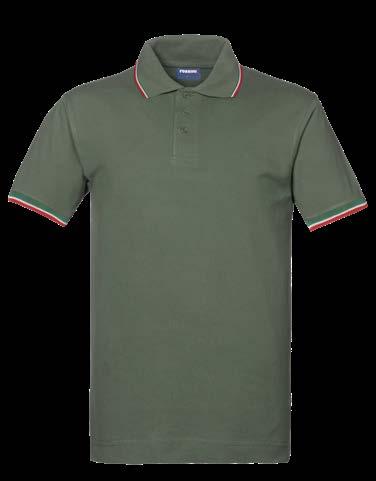 Rinforzo sulla parte posteriore del collo con fascia parasudore interna. Collo con profilo tricolore chiuso con tre bottoni, giromanica a costina con profilo tricolore. Spacchetti laterali al fondo con inserto tricolore.