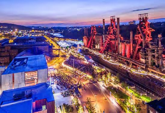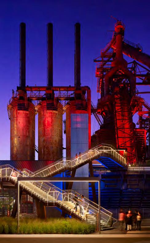 Inspired by Duisburg-Nord’s success, other projects such as the Steel Stacks in Bethlehem, PA stand to repeat many of its successes while creating a more historically conscious lighting scheme. With both projects, the lighting is meant to amaze and attract, yet the Steel Stacks made a conscious decision to restrain the color spectrum of their lighting conditions to red and blue, to reflect the historical inferno that once inhabited the repurposed steel mill. Events run nearly all day at the ArtQuest Center in front of the steel stacks, ending in the late evening to midnight or even later on special occasions. The designers Wallace Roberts & Todd and L’Observatoire