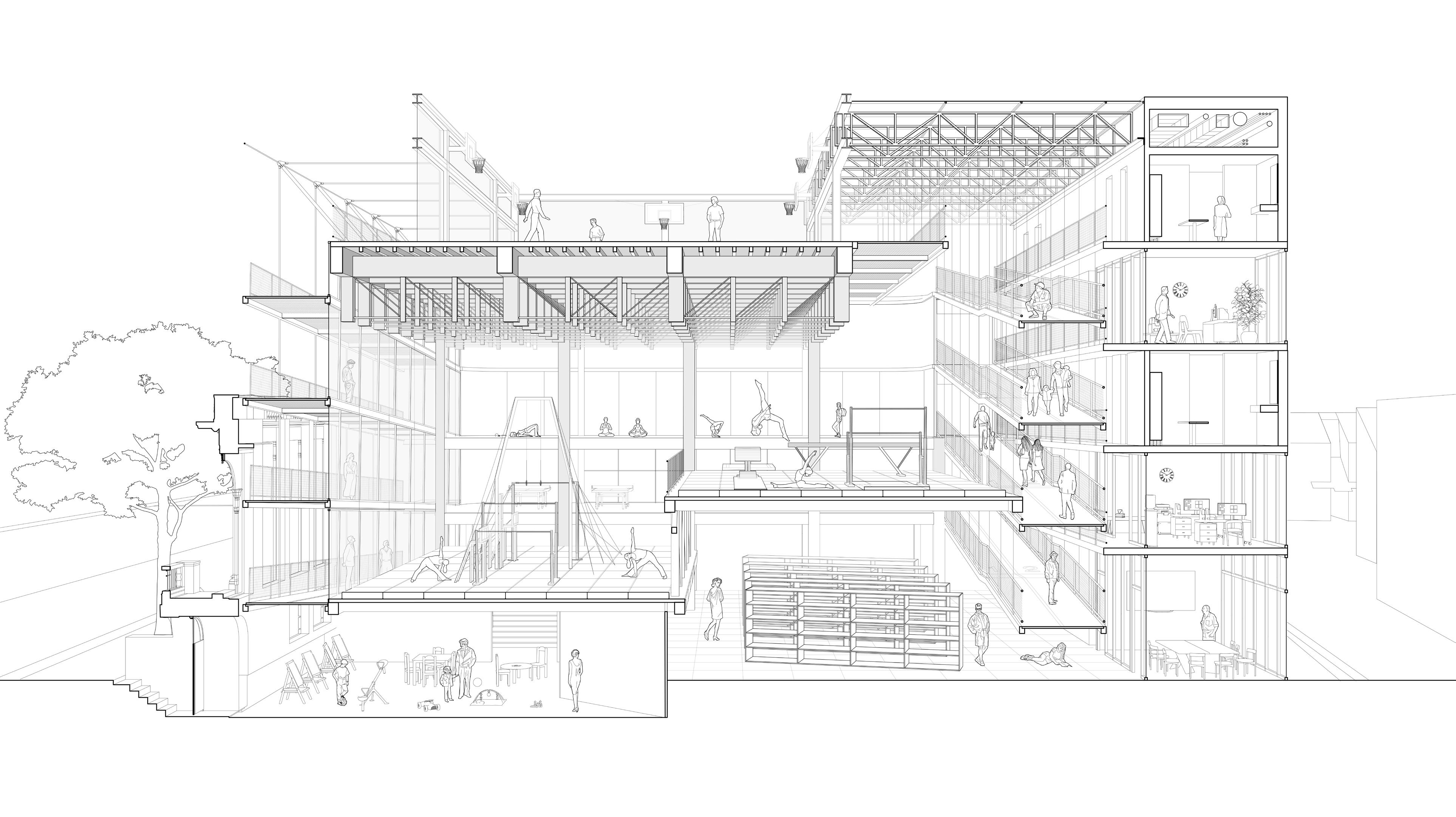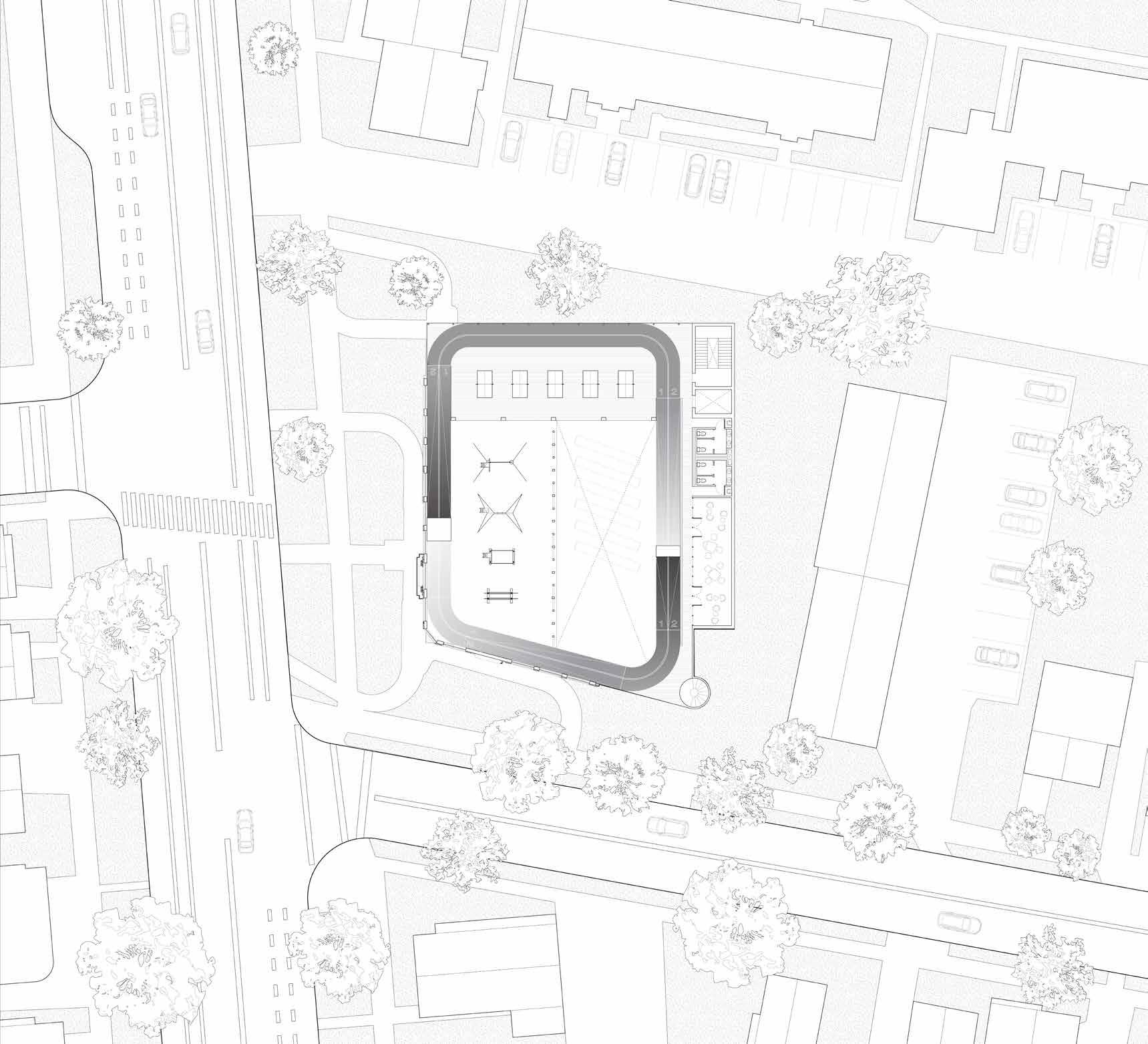 Using the enveloping nature of the running track sectionally, the athletic facility expresses physical activity not only in singular programmatic nodes, but in the circulation between the spaces.