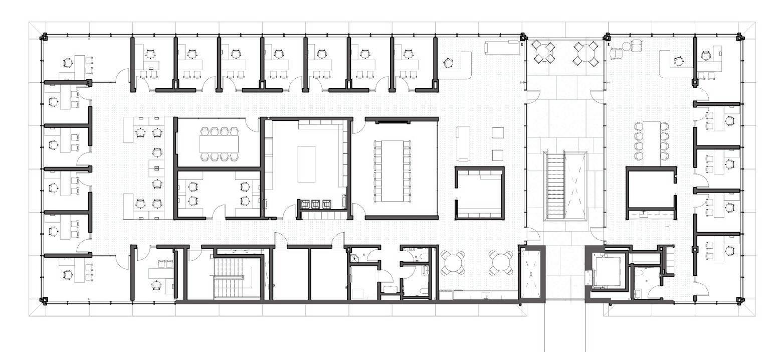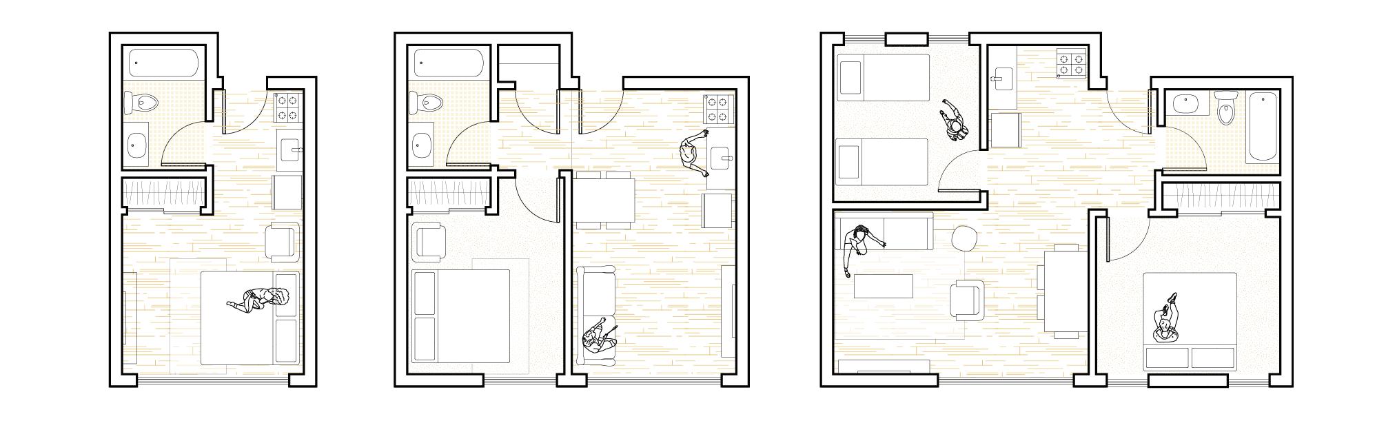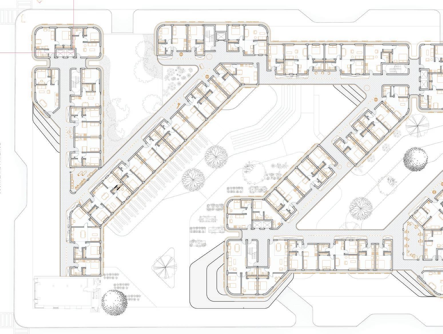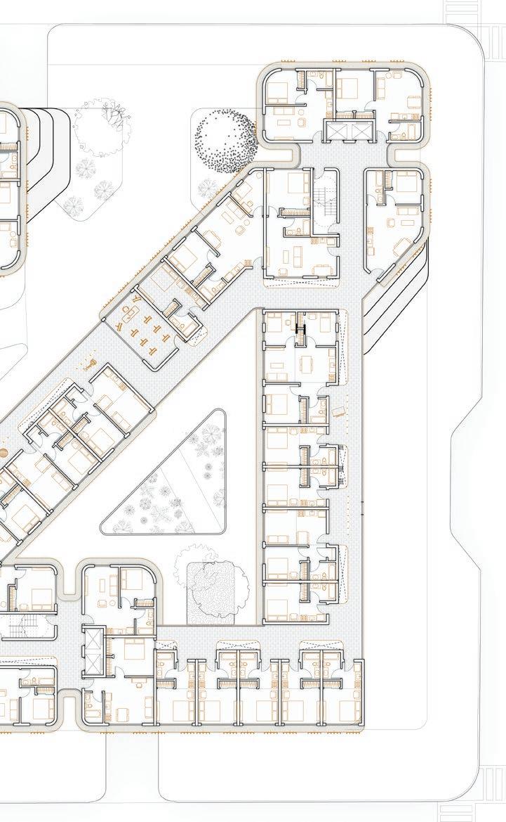 The units range from a studio to three bedrooms. Where the volume is linear, they follow typical designed layouts. In the ‘mounds’, the units become customized, changing per floor. Where there is a switch on corridor paths, the adjacent rooms become community rooms, such as art rooms, computer, and laundry rooms.