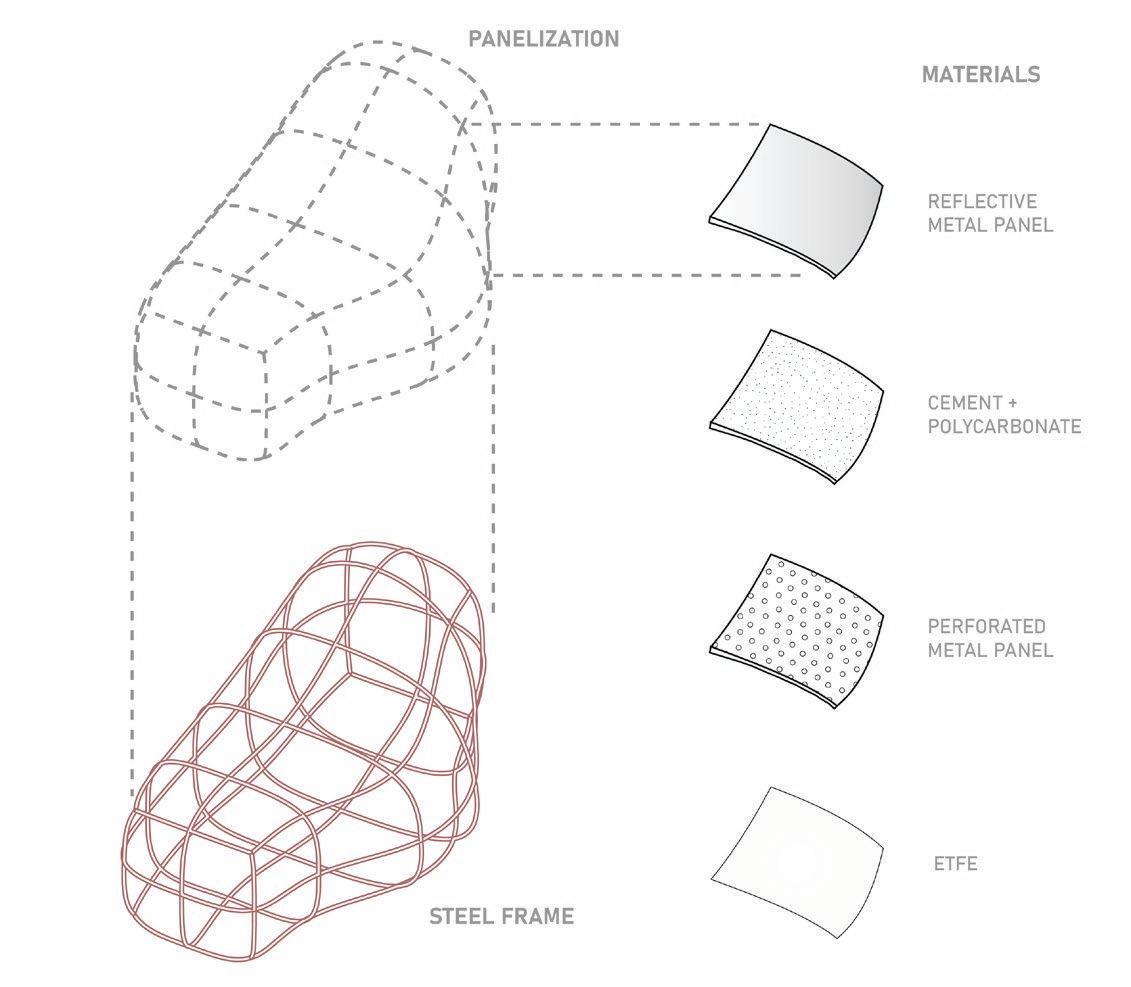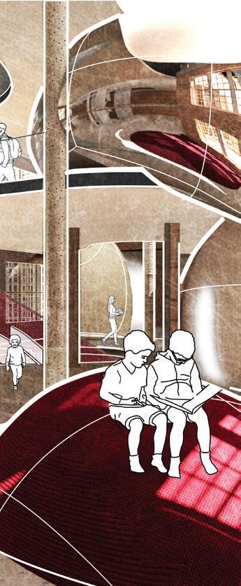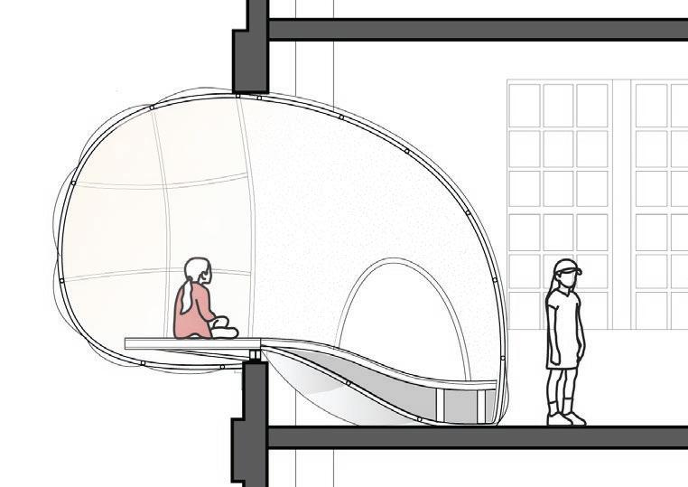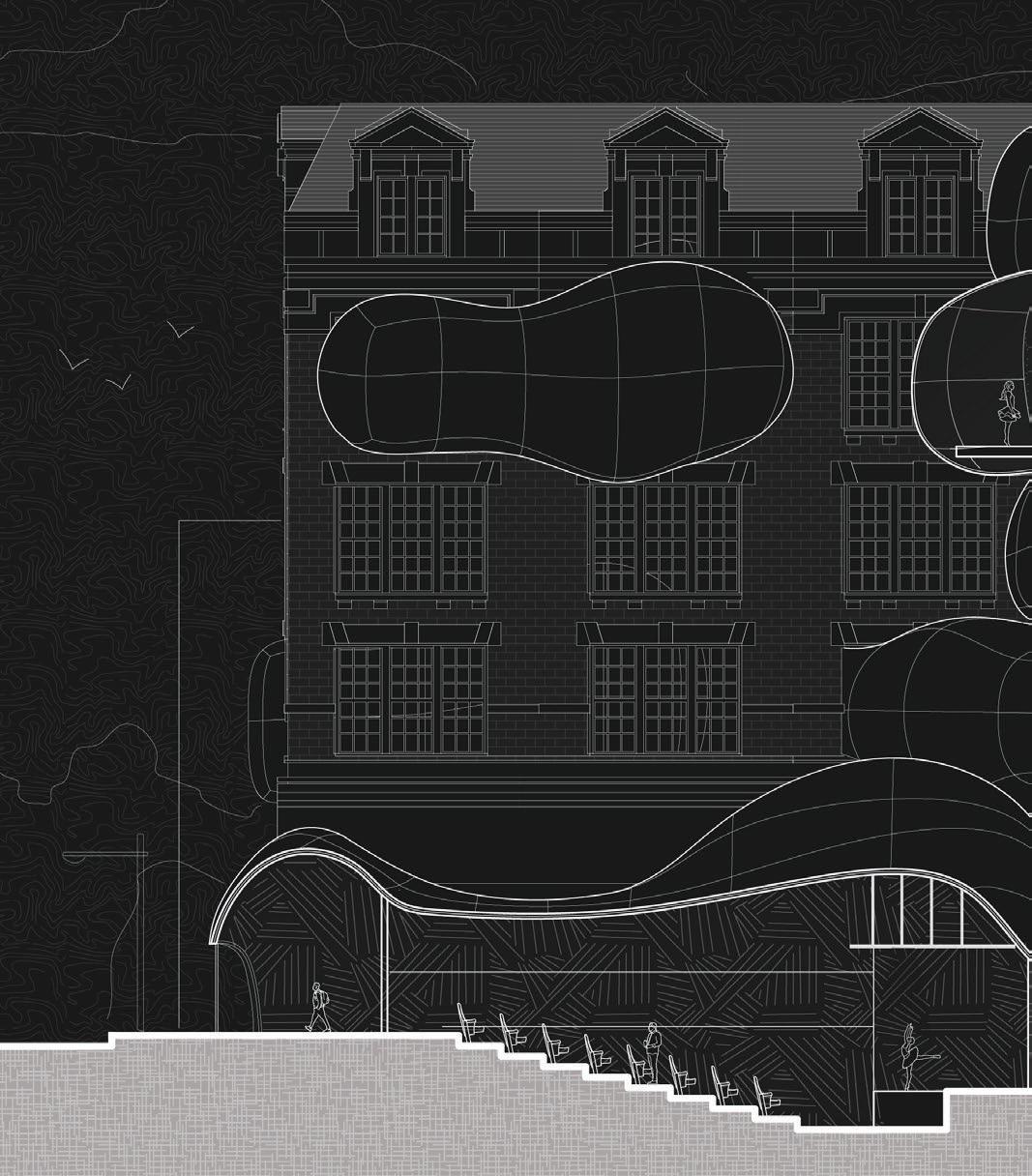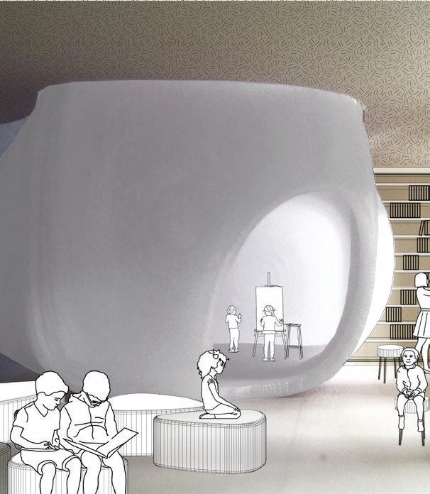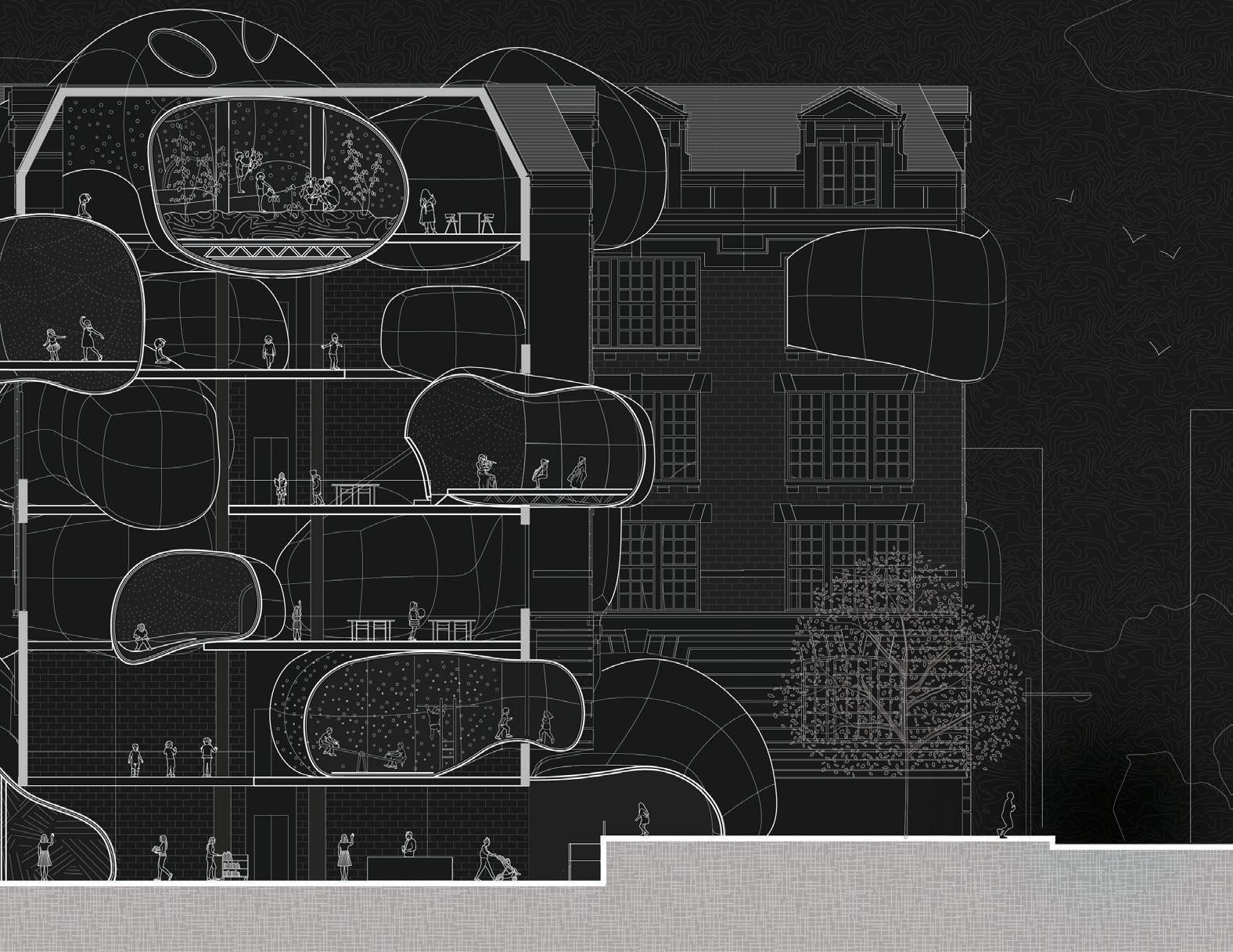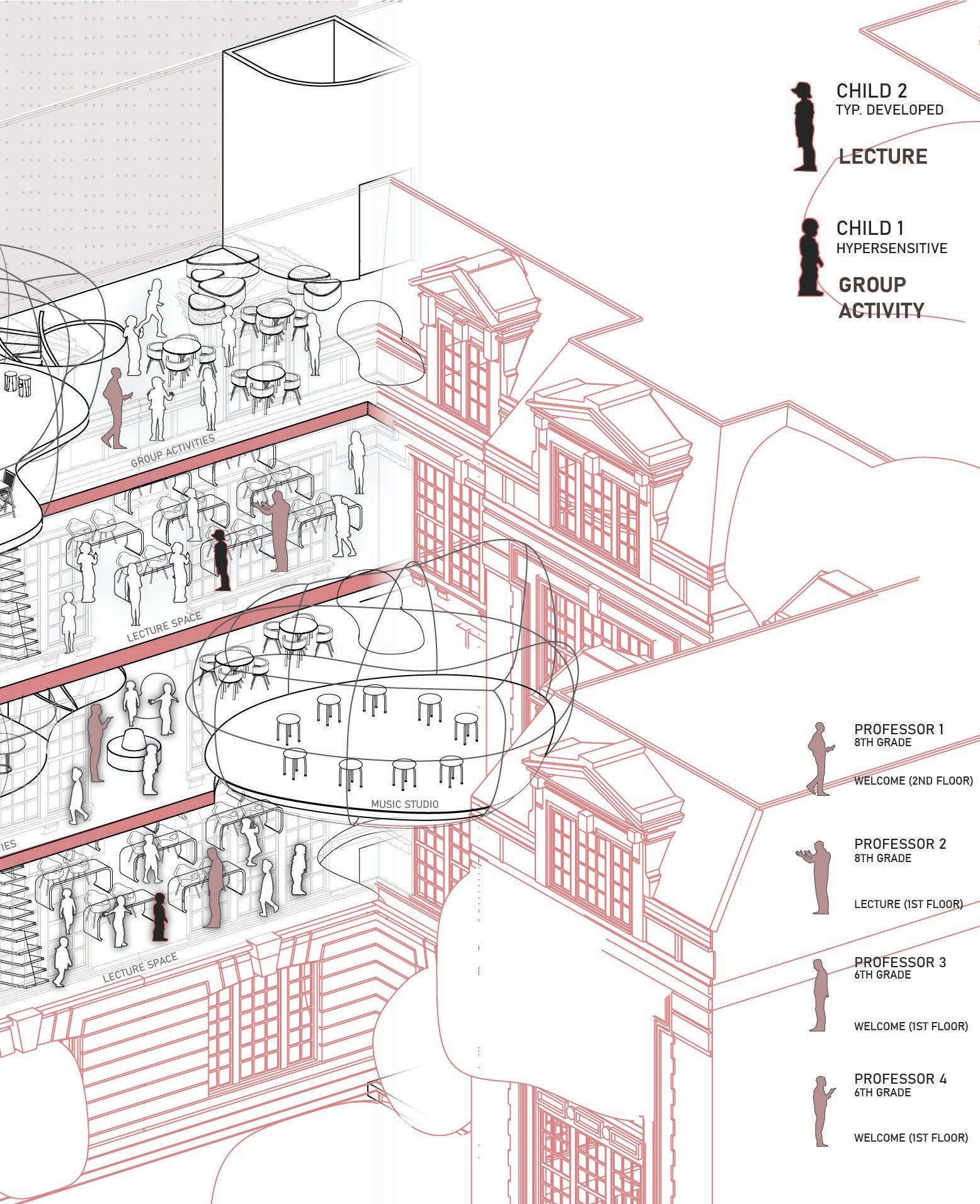 The organic cells, embedded in the existing building, create varied experiences for students. Hosting specific school programs, they feature different materials to control sensory stimuli. The cells interact with the structure in diverse ways based on the program.