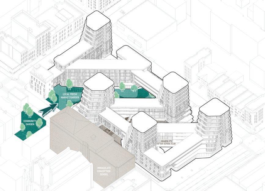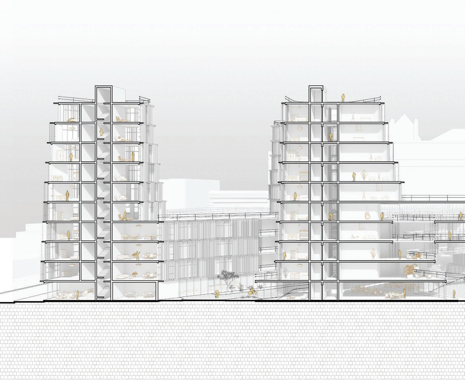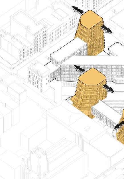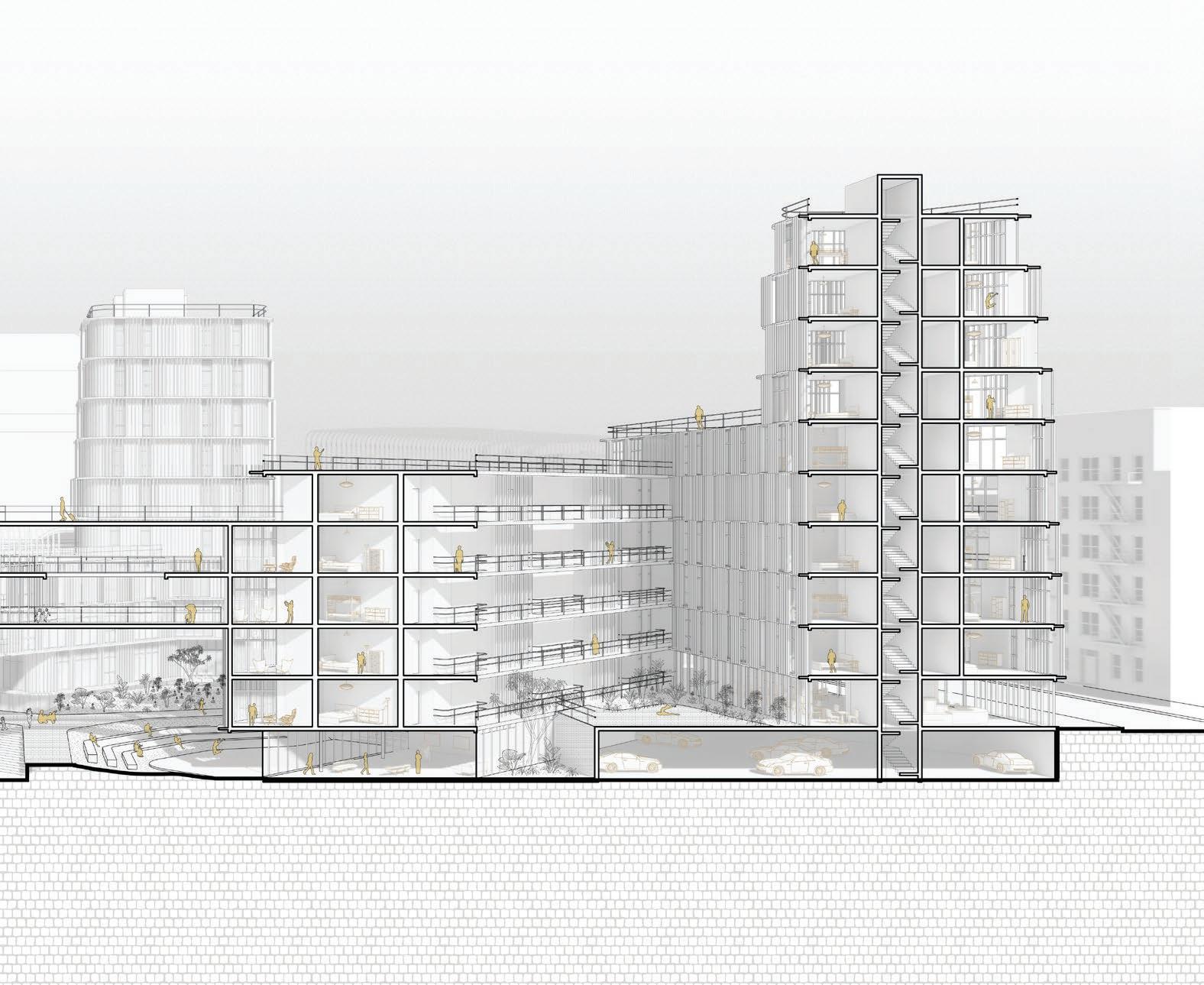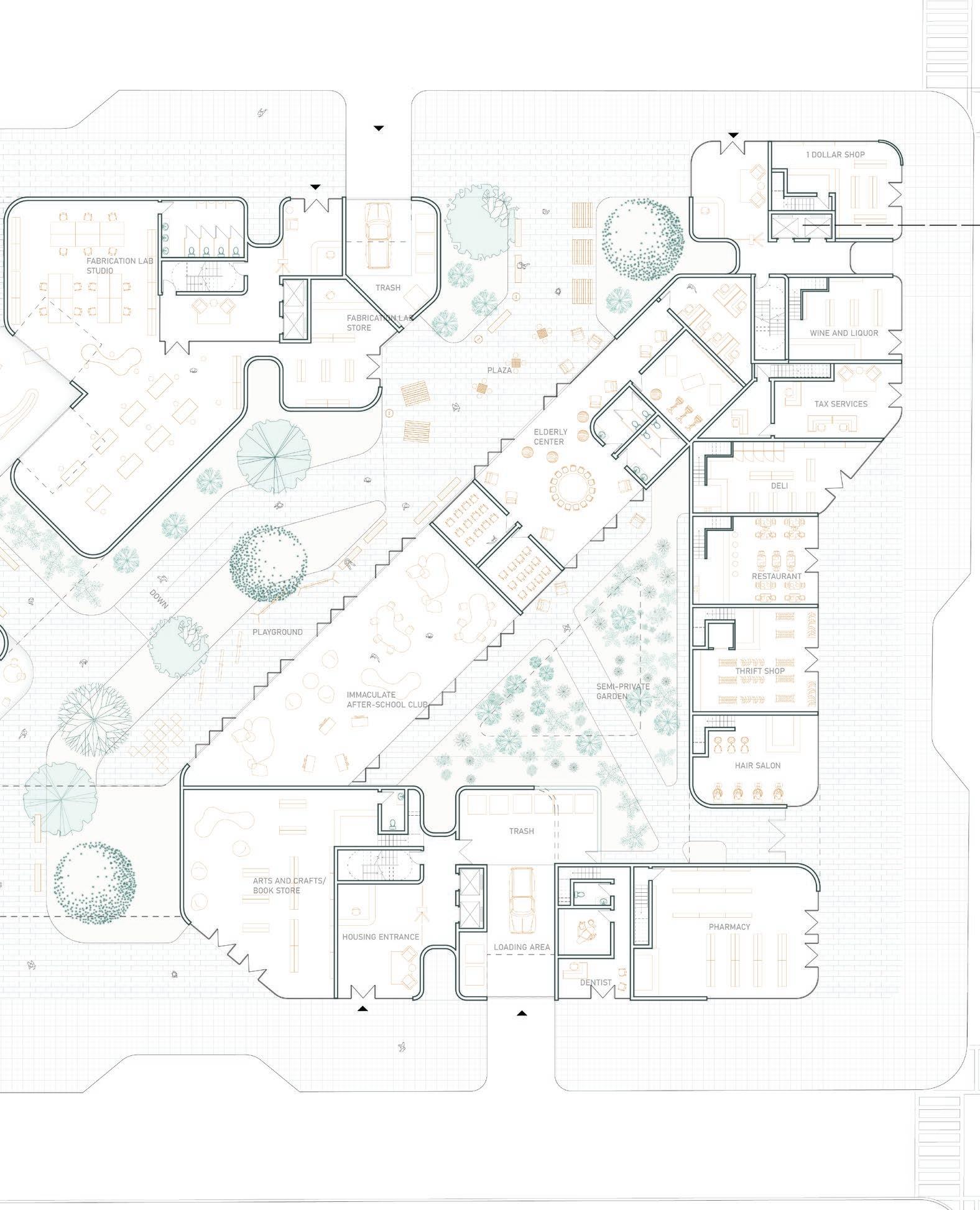 The design was conceived from the ground up. The ground floor is destined for community resources and local commerces that are linked to anchor institutions in the Bronx. The shophouse typology allows the owners of small businesses to live in the complex. Finally, The massing creates density in mound-shaped volumes, allowing less shadow projection area onto the facade, and maximizing the number of units with access to sunlight and ventilation.