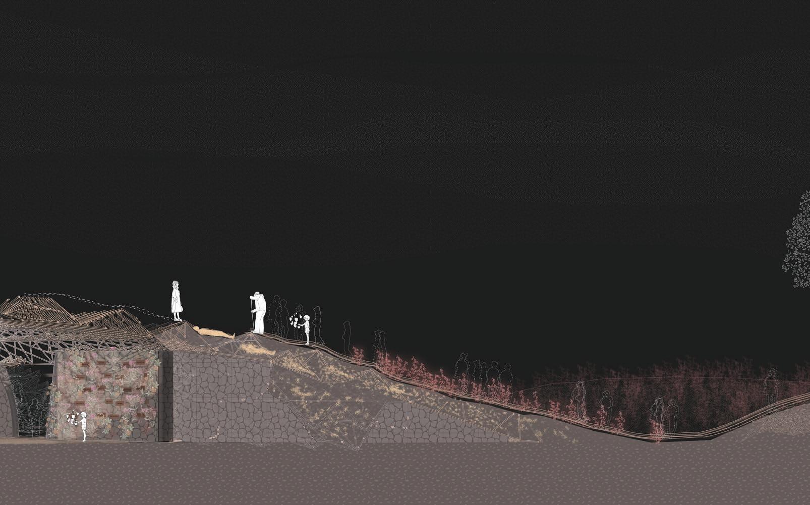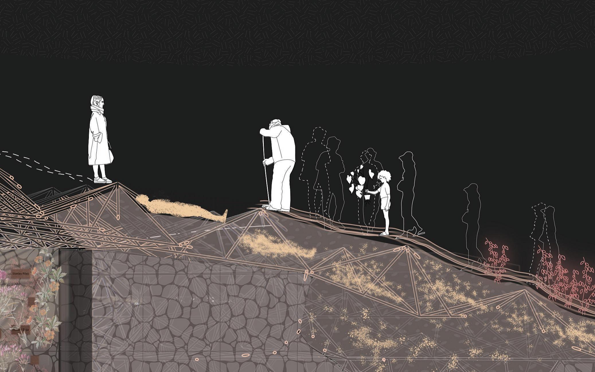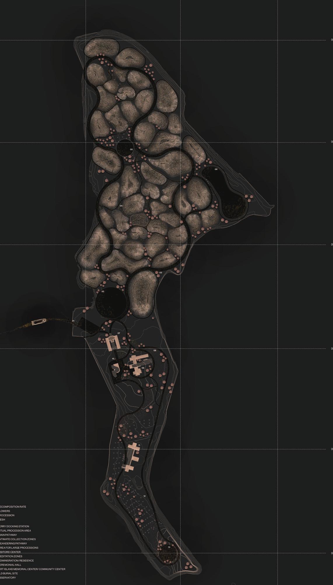 This project seeks to transform Hart Island, a mass burial site in the Bronx, into a sanctuary for remembrance and healing. The site, vulnerable to sea-level rise, will reimagine burial practices both ecologically and spiritually. Drawing on ancient burial mound techniques, we will elevate the mass burials while extending the island’s resilience against the water. The mounds will shift over time, responding to grief, loss, and the cycles of life and death. Ultimately, the project aims to redefine Hart Island as a public sanctuary.